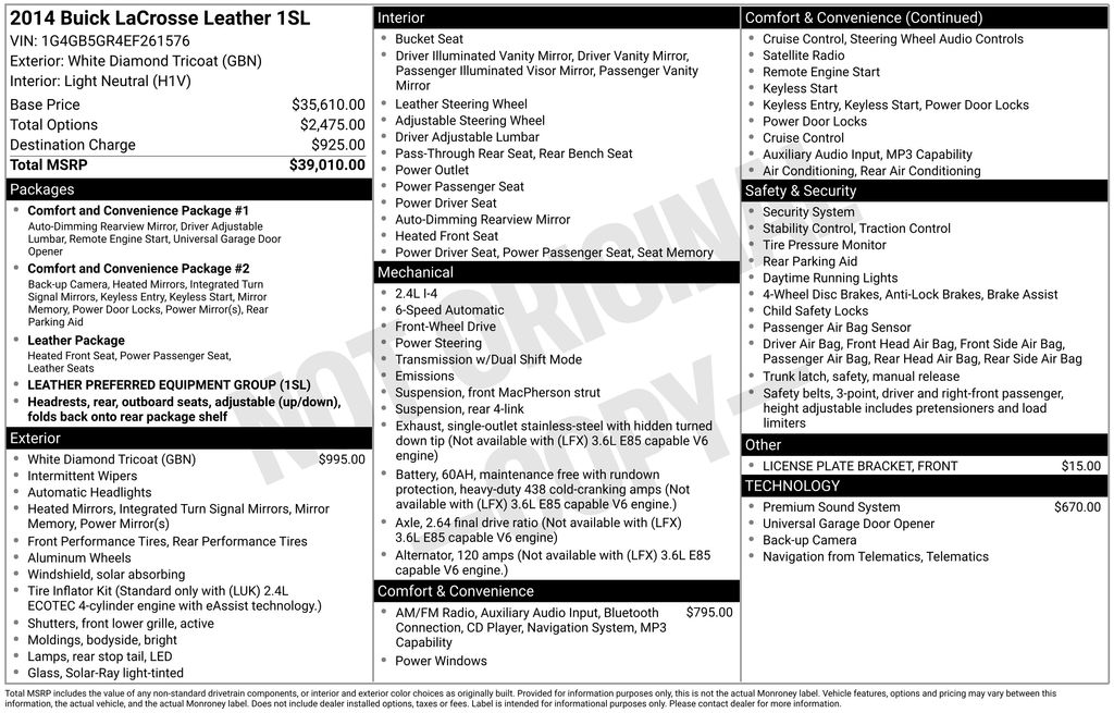 2014 Buick LaCrosse Leather Group White Diamond Tricoat Leather Group FWD 6-Speed Automatic ECOTEC 2.4L I4 DGI DOHC 120 Amp Alternator, 2.64 Final Drive Axle Ratio, 4-Way Power Driver Lumbar Seat Adjuster, 4-Wheel Antilock 4-Wheel Disc w/Brake Assist, 4-Wheel Disc Brakes, 7 Speakers, 8-Way Power Driver Seat Adjuster, 8-Way Power Front Passenger Seat Adjuster, ABS brakes, Air Conditioning, Alloy wheels, AM/FM radio: SiriusXM, Anti-whiplash front head restraints, Auto-dimming door mirrors, Auto-dimming Rear-View mirror, Automatic temperature control, Bodyside moldings, Bose Centerpoint Premium 11-Speaker Surround Sound, Brake assist, Bumpers: body-color, CD player, Compass, Delay-off headlights, Driver door bin, Driver vanity mirror, Dual front impact airbags, Dual front side impact airbags, Electronic Stability Control, Emergency communication system: OnStar Directions & Connections, Exterior Parking Camera Rear, Four wheel independent suspension, Front anti-roll bar, Front Bucket Seats, Front Center Armrest w/Storage, Front dual zone A/C, Front License Plate Bracket, Front Lower Active Grille Shutters, Front reading lights, Fully automatic headlights, Garage door transmitter, Heated door mirrors, Heated Front Bucket Seats, Heated front seats, Illuminated entry, Leather 1SL, Leather-Appointed Seat Trim, Low tire pressure warning, Maintenance Free 60AH Battery w/Rundown Protection, Memory seat, Occupant sensing airbag, Outside temperature display, Overhead airbag, Panic alarm, Passenger door bin, Passenger vanity mirror, Power door mirrors, Power driver seat, Power passenger seat, Power steering, Power windows, Premium 7-Speaker Audio System Feature, Premium audio system: IntelliLink, Radio data system, Radio: Buick IntelliLink AM/FM Stereo w/CD Player, Radio: Buick IntelliLink AM/FM Stereo w/Navigation, Rear anti-roll bar, Rear reading lights, Rear seat center armrest, Rear side impact airbag, Rear window defroster, Remote keyless entry, Security system, Single-Outlet Hidden Exhaust, SIRIUSXM Satellite Radio, Speed control, Split folding rear seat, Steering wheel mounted audio controls, Tachometer, Telescoping steering wheel, Tilt steering wheel, Traction control, Trip computer, Turn signal indicator mirrors, Variably intermittent wipers, Voltmeter, Wheels: 17" Machine-Faced Silver Painted Aluminum.