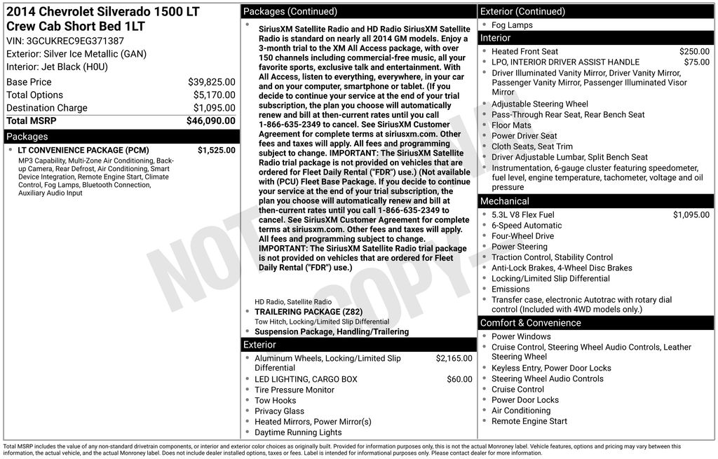 2014 Chevrolet Silverado 1500 LT LT1 Silver Ice Metallic LT LT1 4WD 6-Speed Automatic Electronic with Overdrive EcoTec3 5.3L V8 Flex Fuel 6-Speed Automatic Electronic with Overdrive, 4WD, Black Cloth, 10-Way Power Driver's Seat Adjuster, 110-Volt AC Power Outlet, 150 Amp Alternator, 3.42 Rear Axle Ratio, 4-Wheel Disc Brakes, 4.2" Diagonal Color Display Driver Info Center, 40/20/40 Front Split Bench Seat, 6 Speaker Audio System, 6 Speakers, ABS brakes, Air Conditioning, Alloy wheels, AM/FM radio: SiriusXM, Auxiliary External Transmission Oil Cooler, Black Power Adjustable Heated Outside Mirrors, Bluetooth® For Phone, Brake assist, Bumpers: chrome, CD player, Cloth Seat Trim, Color-Keyed Carpeting w/Rubberized Vinyl Floor Mats, Compass, Deep-Tinted Glass, Delay-off headlights, Driver & Front Passenger Illuminated Vanity Mirrors, Driver door bin, Driver vanity mirror, Dual front impact airbags, Dual front side impact airbags, Dual-Zone Automatic Climate Control, Electric Rear-Window Defogger, Electronic Stability Control, Emergency communication system: OnStar Directions & Connections, EZ Lift & Lower Tailgate, Front anti-roll bar, Front Center Armrest w/Storage, Front Chrome Bumper, Front Frame-Mounted Black Recovery Hooks, Front Halogen Fog Lamps, Front reading lights, Front wheel independent suspension, Fully automatic headlights, Heated door mirrors, Heated Driver & Front Passenger Seats, Heavy-Duty Rear Locking Differential, Illuminated entry, Interior Driver Assist Handle (LPO), Leather Wrapped Steering Wheel w/Cruise Controls, LED Cargo Box Lighting, Low tire pressure warning, LT Convenience Package, Manual Tilt Wheel Steering Column, Occupant sensing airbag, OnStar 6 Months Directions & Connections Plan, Outside temperature display, Overhead airbag, Overhead console, Panic alarm, Passenger door bin, Passenger vanity mirror, Power door mirrors, Power steering, Power windows, Power Windows w/Driver Express Up, Premium audio system: Chevrolet MyLink, Radio data system, Radio: AM/FM 8" Diagonal Color Touch Screen, Radio: AM/FM Audio System w/Chevrolet MyLink, Rear 60/40 Folding Bench Seat (Folds Up), Rear Chrome Bumper, Rear reading lights, Rear seat center armrest, Rear step bumper, Rear Vision Camera w/Dynamic Guide Lines, Rear Wheelhouse Liners, Remote Keyless Entry, Remote keyless entry, Remote Vehicle Starter System, Single Slot CD/MP3 Player, SiriusXM Satellite & HD Radio, Speed control, Speed-sensing steering, Split folding rear seat, Steering Wheel Audio Controls, Steering wheel mounted audio controls, Tachometer, Theft Deterrent System (Unauthorized Entry), Tilt steering wheel, Traction control, Trailering Equipment, Trip computer, Variably intermittent wipers, Voltmeter, Wheels: 17" x 8" Bright Machined Aluminum, Wheels: 20" x 9" Polished-Aluminum, 6-Speed Automatic Electronic with Overdrive, 4WD, Black Cloth.