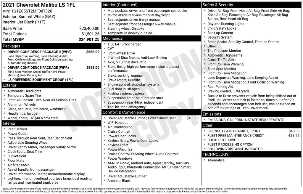 Used 2021 ChevroletMalibu LS w/1FL Sedan I-4 cyl