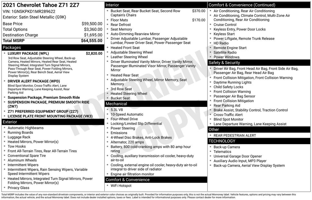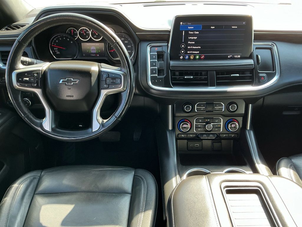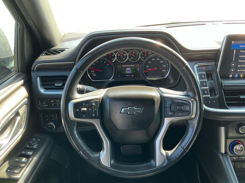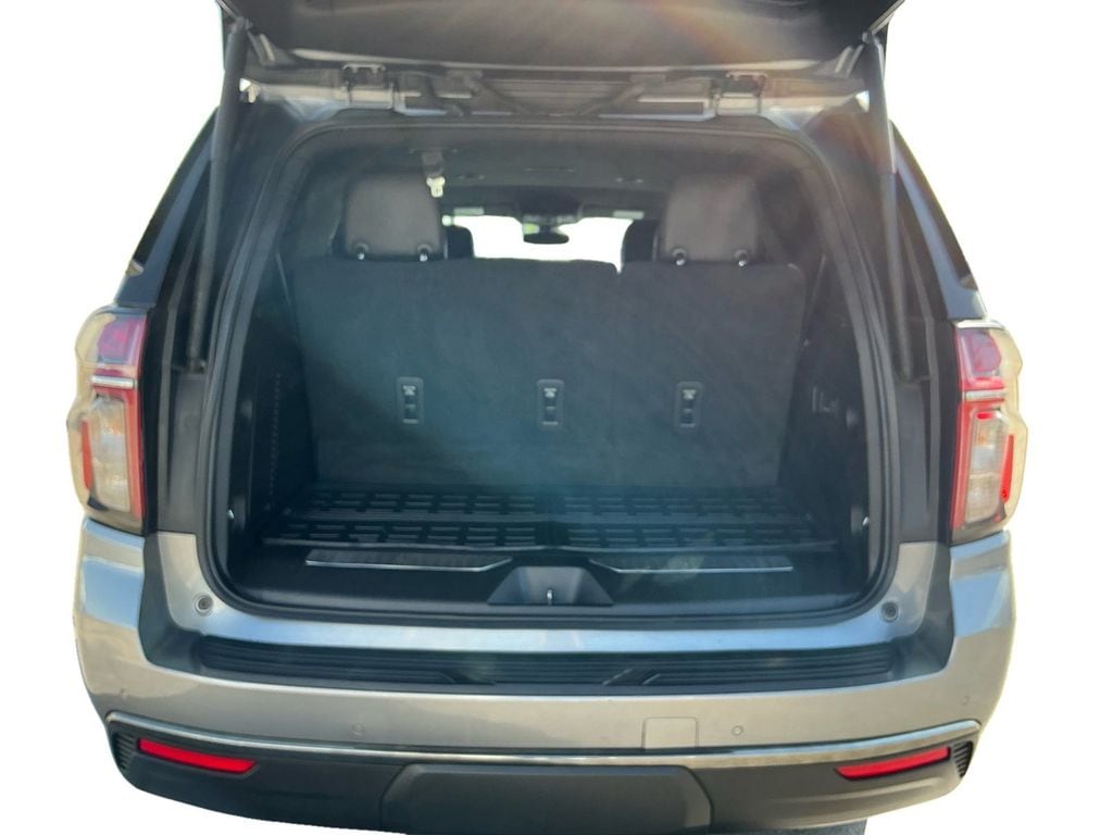 2021 Chevrolet Tahoe Z71 Satin Steel Metallic Z71 4WD 10-Speed Automatic with Overdrive EcoTec3 5.3L V8 4WD, Jet Black Leather, 10-Way Power Driver & Passenger Seat Adjusters, 1st & 2nd Row Color-Keyed Carpeted Floor Mats, 2 USB Data Ports, 2-Speed Active Electronic AutoTrac Transfer Case, 2nd Row Pwr Release 60/40 Split-Folding Bench Seat, 3.23 Rear Axle Ratio, 3rd Row 60/40 Power-Folding Split-Bench Seat, 3rd row seats: split-bench, 4-Wheel Disc Brakes, 9 Speakers, ABS brakes, Air Conditioning, All-Weather Floor Mats, Alloy wheels, AM/FM radio: SiriusXM with 360L, Apple CarPlay/Android Auto, Auto High-beam Headlights, Auto-Dimming Inside Rear-View Mirror, Auto-dimming Rear-View mirror, Automatic Heated Steering Wheel, Automatic temperature control, Black Tubular Assist Steps, Bose 9-Speaker Stereo Audio System Feature, Brake assist, Bright Front & Rear Door Sill Plates, Bumpers: body-color, Color-Keyed Carpeting Floor Covering, Compass, Delay-off headlights, Driver & Front Outboard Passenger Airbags, Driver Alert Package, Driver door bin, Driver vanity mirror, Dual front impact airbags, Dual front side impact airbags, Electronic Stability Control, Emergency communication system: OnStar and Chevrolet connected services capable, Floor Console w/Storage Area, Four wheel independent suspension, Front & Rear Park Assist, Front anti-roll bar, Front Bucket Seats, Front Center Armrest, Front dual zone A/C, Front High-Approach Angle Fascia, Front High-Back Reclining Bucket Seats, Front reading lights, Fully automatic headlights, Garage door transmitter, Hands-Free Rear Power Programmable Liftgate, HD Radio, HD Surround Vision, Heated 2nd Row Outboard Seats, Heated door mirrors, Heated Driver & Front Passenger Seats, Heated front seats, Hill Descent Control, Illuminated entry, Infotainment Display, Lane Change Alert w/Side Blind Zone Alert, Lane Keep Assist w/Lane Departure Warning, Leather Seat Trim, Leather steering wheel, Leather-Wrapped Steering Wheel, LED Daytime Running Lamps, License Plate Front Mounting Package, Low tire pressure warning, Luxury Package, Memory seat, Memory Settings, Memory Settings for Driver, Occupant sensing airbag, Outside Heated Power-Adjustable Mirrors, Outside temperature display, Overhead airbag, Overhead console, Panic alarm, Passenger door bin, Passenger vanity mirror, Power door mirrors, Power driver seat, Power Liftgate, Power passenger seat, Power Release 2nd Row Bucket Seats, Power steering, Power Tilt & Telescopic Steering Column, Power windows, Preferred Equipment Group 2Z7, Premium audio system: Chevrolet Infotainment 3, Premium Smooth Ride Suspension, Radio: Chevrolet Infotainment 3 Plus System, Rain sensing wipers, Rear air conditioning, Rear anti-roll bar, Rear Cross Traffic Alert, Rear Pedestrian Alert, Rear reading lights, Rear seat center armrest, Rear window defroster, Rear window wiper, Red Horizontal-Mounted Recovery Hooks, Remote keyless entry, Remote Start, Roof rack: rails only, Security system, SiriusXM Radio w/360L, Speed control, Speed-sensing steering, Split folding rear seat, Spoiler, Steering wheel mounted audio controls, Tachometer, Telescoping steering wheel, Tilt steering wheel, Traction control, Trip computer, Universal Home Remote, Variably intermittent wipers, Voltmeter, Wheels: 20" x 9" Machined Aluminum, 4WD, Jet Black Leather.