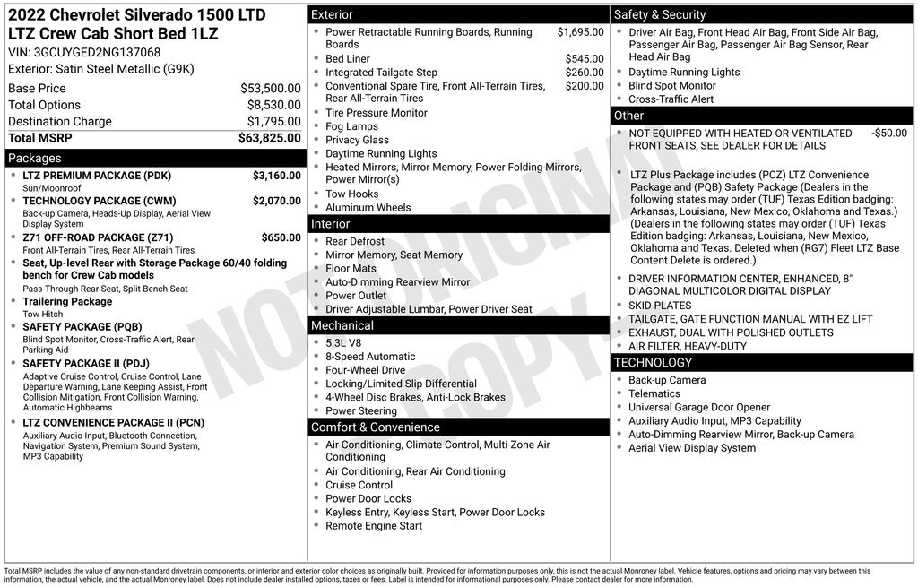 2022 Chevrolet Silverado 1500 LTD LTZ Satin Steel Metallic LTZ 4WD 8-Speed Automatic EcoTec3 5.3L V8 10-Way Power Driver Seat w/Lumbar, 10-Way Power Passenger Seat Adjuster w/Lumbar, 12-Volt Rear Auxiliary Power Outlet, 120-Volt Bed Mounted Power Outlet, 120-Volt Instrument Panel Power Outlet, 15" Diagonal Multicolor Head-Up Display, 170 Amp Alternator, 2 USB Ports, 2 USB Ports (First Row), 3.23 Rear Axle Ratio, 4-Wheel Disc Brakes, 4.2" Diagonal Color Display Driver Info Center, 6 Speakers, 6-Speaker Audio System, 8" Driver Information Center, ABS brakes, Adaptive Cruise Control, Advanced Trailering System, Air Conditioning, Alloy wheels, AM/FM radio: SiriusXM with 360L, Apple CarPlay/Android Auto, Auto-dimming door mirrors, Auto-Dimming Inside Rear-View Mirror, Auto-dimming Rear-View mirror, Auto-Locking Rear Differential, Automatic Emergency Braking, Automatic temperature control, Auxiliary External Transmission Oil Cooler, Bed View Camera, Bluetooth® For Phone, Brake assist, Bumpers: chrome, Chevrolet Connected Access Capable, Chevytec Spray-On Black Bedliner, Chrome Grille, Chrome Mirror Caps, Color-Keyed Carpeting Floor Covering, Compass, Deep-Tinted Glass, Delay-off headlights, Driver door bin, Driver Memory, Driver vanity mirror, Dual Exhaust w/Polished Outlets, Dual front impact airbags, Dual front side impact airbags, Electric Rear-Window Defogger, Electronic Cruise Control, Electronic Stability Control, EZ Lift Power Lock & Release Tailgate, Floor Mounted Center Console, Following Distance Indicator, Forward Collision Alert, Front anti-roll bar, Front Bucket Seats, Front Center Armrest, Front dual zone A/C, Front fog lights, Front Frame-Mounted Black Recovery Hooks, Front LED Fog Lamps, Front License Plate Kit, Front Pedestrian Braking, Front reading lights, Front Rubberized Vinyl Floor Mats, Front wheel independent suspension, Fully automatic headlights, Garage door transmitter, HD Rear Vision Camera, HD Surround Vision w/2 Trailer View Camera Provisions, Heated door mirrors, Heated Driver & Front Outboard Passenger Seats, Heated front seats, Heated Steering Wheel, Heated steering wheel, Heavy Duty Suspension, Heavy-Duty Air Filter, Hill Descent Control, Hitch Guidance, Hitch Guidance w/Hitch View, Illuminated entry, Integrated Trailer Brake Controller, IntelliBeam Automatic High Beam On/Off, Keyless Open & Start, Lane Change Alert w/Side Blind Zone Alert, Lane Keep Assist w/Lane Departure Warning, Leather Wrapped Steering Wheel, LED Cargo Area Lighting, Low tire pressure warning, LTZ Convenience Package, LTZ Convenience Package II, LTZ Plus Package, LTZ Premium Package, Manual Tilt/Telescoping Steering Column, Memory seat, Multi-Flex Tailgate, Not Equipped w/Heated/Ventilated Front Seats, Occupant sensing airbag, Off-Road Suspension, OnStar & Chevrolet Connected Services Capable, Outside Heated Power-Adjustable Mirrors, Outside temperature display, Overhead airbag, Overhead console, Panic alarm, Passenger door bin, Passenger vanity mirror, Perforated Leather-Appointed Front Seat Trim, Perimeter Lighting, Power Door Locks, Power door mirrors, Power driver seat, Power Front Passenger Windows w/Express Up/Down, Power Front Windows w/Driver Express Up/Down, Power passenger seat, Power Rear Windows w/Express Down, Power Sliding Rear Window w/Rear Defogger, Power steering, Power Sunroof, Power Tailgate, Power windows, Power-Retractable Assist Steps, Preferred Equipment Group 1LZ, Premium audio system: Chevrolet Infotainment 3 Plus, Premium Bose 7-Speaker Sound System, Radio data system, Radio: Chevrolet Infotainment 3 Plus System, Radio: Chevrolet Infotainment 3 Premium System, Rear Camera Mirror, Rear Cross Traffic Alert, Rear Dual USB Charging-Only Ports, Rear reading lights, Rear Rubberized-Vinyl Floor Mats, Rear seat center armrest, Rear step bumper, Rear Wheelhouse Liners, Rear window defroster, Remote keyless entry, Remote Vehicle Starter System, Safety Alert Seat, Safety Package, Safety Package II, Security syst