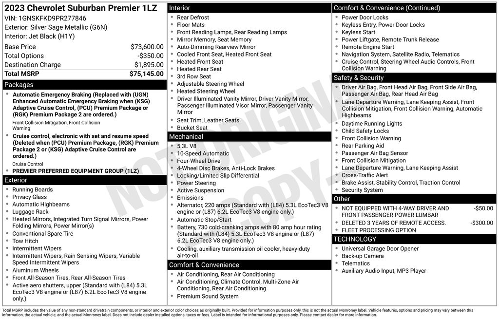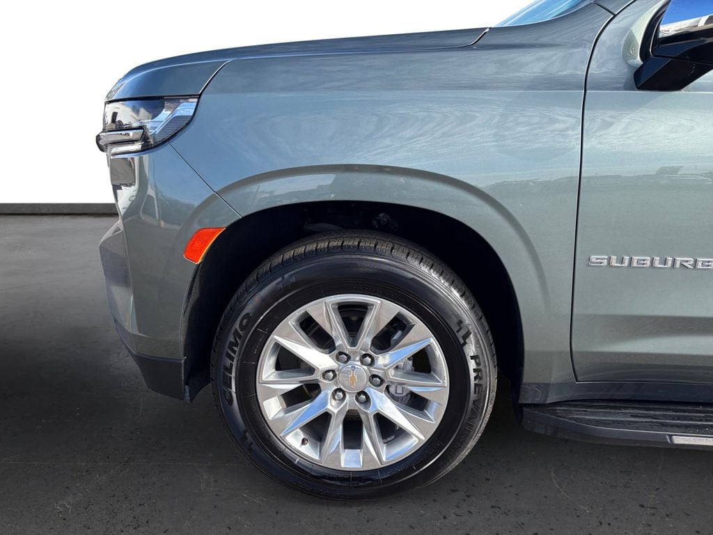 2023 Chevrolet Suburban Premier Silver Sage Metallic Premier 4WD 10-Speed Automatic with Overdrive EcoTec3 5.3L V8 10 Speakers, 1st & 2nd Row Color-Keyed Carpeted Floor Mats, 2-Speed Active Electronic AutoTrac Transfer Case, 20" x 9" Polished Aluminum Wheels, 3.23 Rear Axle Ratio, 3rd Row 60/40 Power-Folding Split-Bench, 3rd row seats: split-bench, 4-Wheel Disc Brakes, ABS brakes, Adaptive suspension, Air Conditioning, Alloy wheels, AM/FM radio: SiriusXM with 360L, Apple CarPlay/Android Auto, Auto High-beam Headlights, Auto-dimming door mirrors, Auto-Dimming Inside Rear-View Mirror, Auto-dimming Rear-View mirror, Auto-leveling suspension, Automatic temperature control, Bose 10-Speaker Surround w/CenterPoint, Brake assist, Bright Front & Rear Door Sill Plates, Bumpers: body-color, Chrome Door Handles w/Body-Color Strip, Chrome Mirror Caps, Color-Keyed Carpeting Floor Covering, Compass, Delay-off headlights, Deleted 3 Years of Remote Access, Driver & Front Outboard Passenger Airbags, Driver door bin, Driver vanity mirror, Dual Exhaust System, Dual front impact airbags, Dual front side impact airbags, Electronic Stability Control, Emergency communication system: OnStar and Chevrolet connected services capable, Enhanced Driver Information Center, Floor Console, Four wheel independent suspension, Front anti-roll bar, Front Bucket Seats, Front Center Armrest, Front dual zone A/C, Front reading lights, Fully automatic headlights, Garage door transmitter, Hands-Free Rear Power Programmable Liftgate, Heated & Ventilated Driver & Front Passenger Seats, Heated 2nd Row Outboard Seats, Heated door mirrors, Heated Driver & Front Passenger Seats, Heated front seats, Heated rear seats, Heated Steering Wheel, Heated steering wheel, Hill Descent Control, Illuminated entry, Infotainment Display, Lane Change Alert w/Side Blind Zone Alert, LED Daytime Running Lamps, Low tire pressure warning, Magnetic Ride Control Suspension, Memory seat, Memory Settings, Navigation System, Not Equipped w/4-Way Driver & Fr Pass Pwr Lumbar, Occupant sensing airbag, Outside Heated Power-Adjustable Mirrors, Outside temperature display, Overhead airbag, Overhead console, Panic alarm, Passenger door bin, Passenger vanity mirror, Perforated Leather Seating Surfaces, Power door mirrors, Power driver seat, Power Liftgate, Power passenger seat, Power Release 2nd Row Bucket Seats, Power steering, Power Tilt & Telescopic Steering Column, Power windows, Preferred Equipment Group 1LZ, Premium audio system: Chevrolet Infotainment 3 Premium, Radio: Chevrolet Infotainment 3 Premium System, Rain sensing wipers, Rear air conditioning, Rear anti-roll bar, Rear Cross Traffic Alert, Rear reading lights, Rear window defroster, Rear window wiper, Remote keyless entry, Remote Start, Roof rack: rails only, Safety Alert Seat, Security system, SiriusXM Radio w/360L, Speed control, Speed-sensing steering, Split folding rear seat, Spoiler, Steering wheel memory, Steering wheel mounted audio controls, Tachometer, Telescoping steering wheel, Tilt steering wheel, Traction control, Trip computer, Turn signal indicator mirrors, Universal Home Remote, Variably intermittent wipers, Ventilated front seats, Voltmeter, Wireless Charging, Wrapped Steering Wheel.