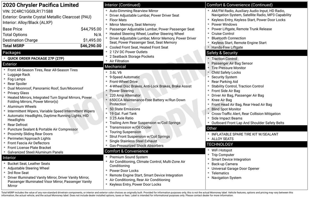 2020 Chrysler Pacifica Limited FWD 9-Speed 948TE Automatic 3.6L V6 24V VVT Granite Crystal Metallic Clearcoat
