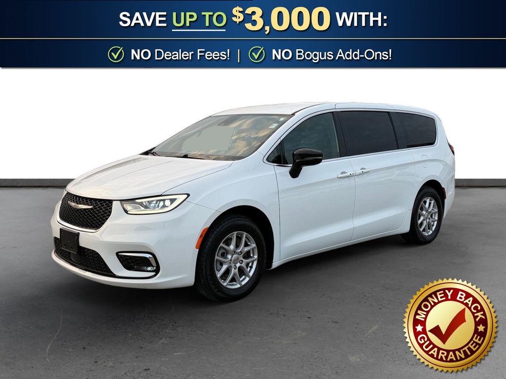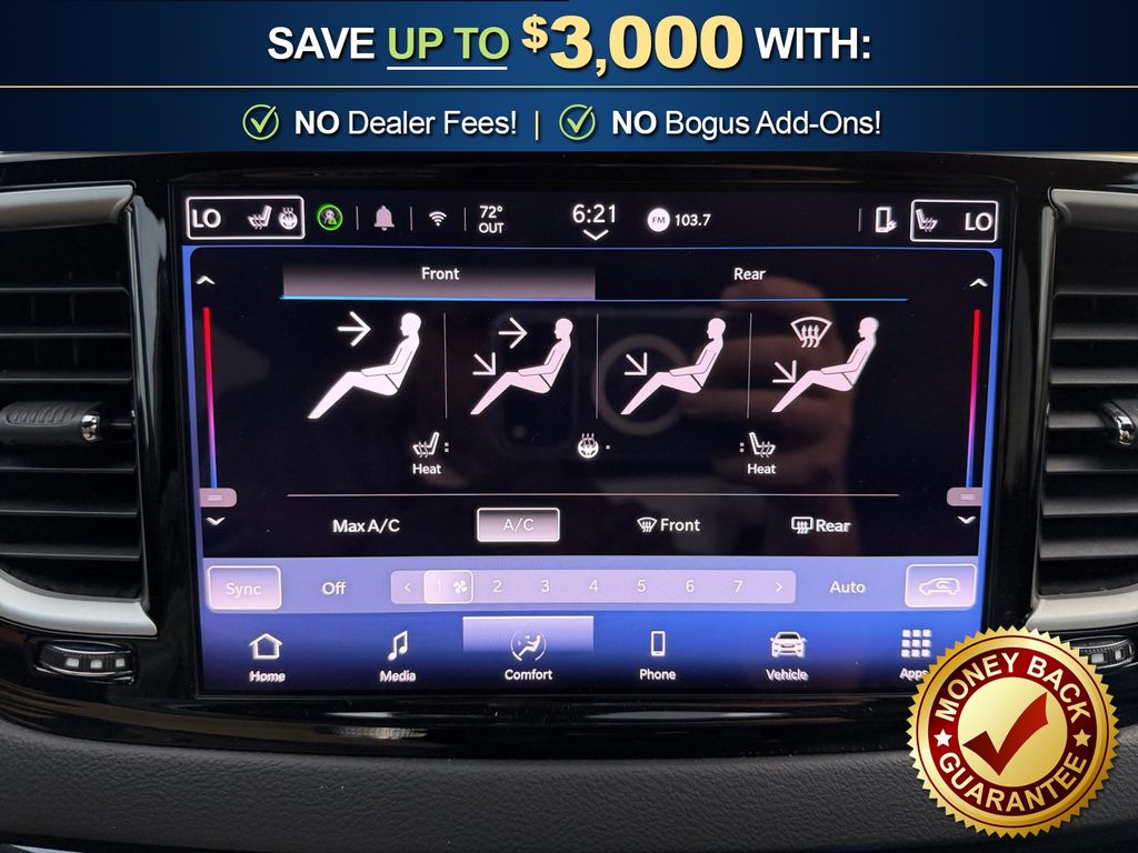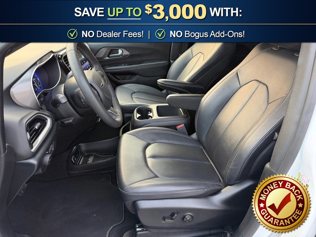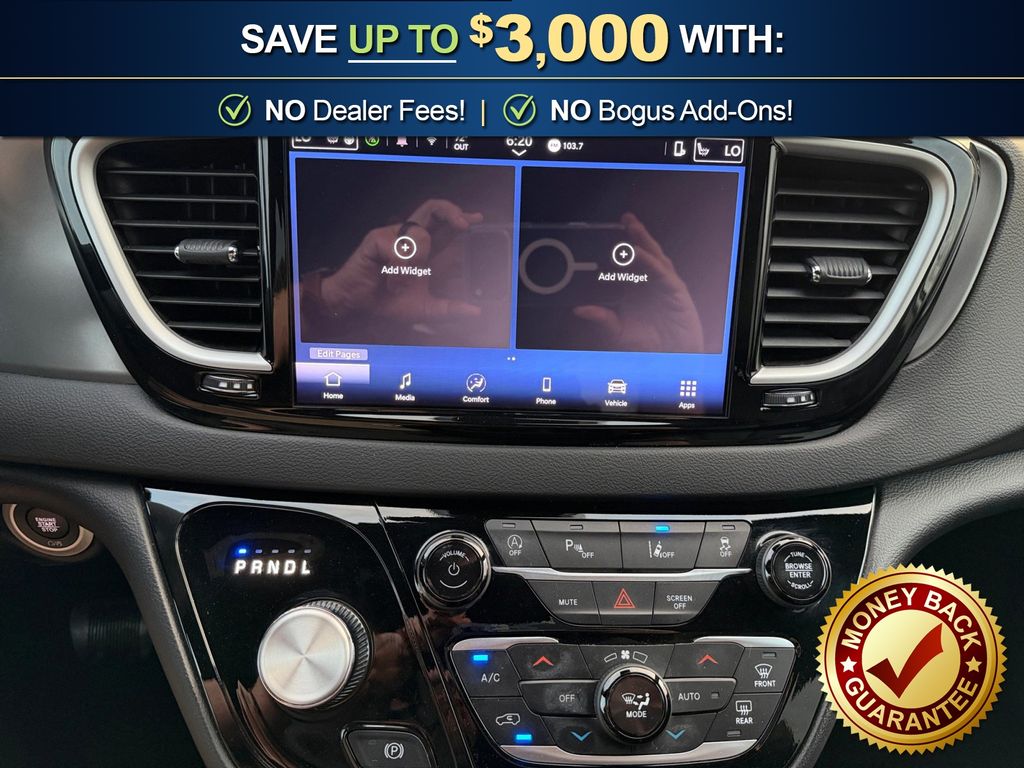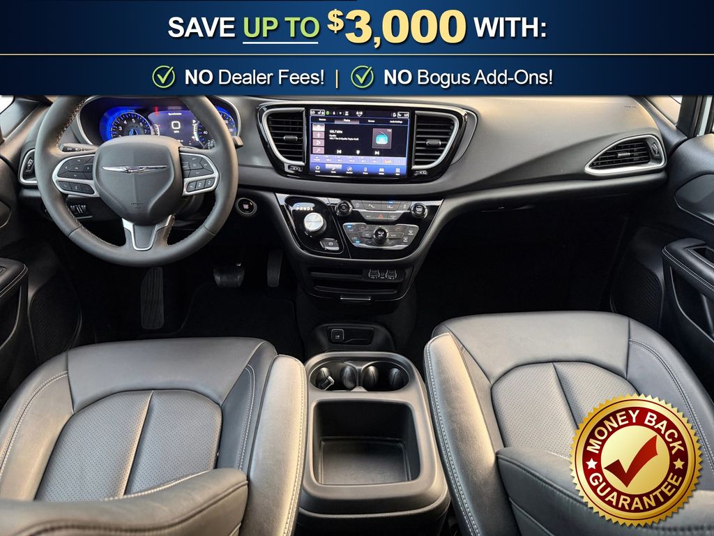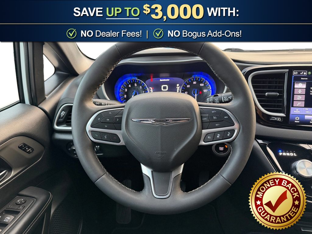 10.1" Touchscreen Display, 17" x 7.0" Aluminum Wheels, 3.25 Axle Ratio, 3rd row seats: split-bench, 4-Wheel Disc Brakes, 4G LTE Wi-Fi Hot Spot, 6 Speakers, ABS brakes, Air Conditioning, Alloy wheels, AM/FM radio: SiriusXM, Apple CarPlay, Apple CarPlay/Android Auto, Auto-dimming Rear-View mirror, Automatic temperature control, Black Seats, Brake assist, Bumpers: body-color, Caprice Leatherette Bucket Seats, Compass, Delay-off headlights, Disassociated Touchscreen Display, Driver door bin, Driver vanity mirror, Driver's Seat Mounted Armrest, Dual front impact airbags, Dual front side impact airbags, Electronic Stability Control, Emergency communication system: Chrysler Connect, For Details, Visit DriveUconnect.com, Four wheel independent suspension, Front anti-roll bar, Front Bucket Seats, Front dual zone A/C, Front Fascia Air Deflectors, Front fog lights, Front reading lights, Fully automatic headlights, Garage door transmitter, Google Android Auto, GPS Antenna Input, Heated door mirrors, Heated front seats, Heated steering wheel, Illuminated entry, Integrated Active Noise Cancellation, Integrated Center Stack Radio, Knee airbag, Low tire pressure warning, Manufacturer's Statement of Origin, Memory seat, Occupant sensing airbag, Outside temperature display, Overhead airbag, Overhead console, Panic alarm, ParkView Rear Back-Up Camera, Passenger door bin, Passenger seat mounted armrest, Passenger vanity mirror, Power door mirrors, Power driver seat, Power Liftgate, Power steering, Power windows, Quick Order Package 27L, Radio data system, Radio: Uconnect 5 with 10.1" Display, Rain sensing wipers, Rear air conditioning, Rear reading lights, Rear window defroster, Rear window wiper, Reclining 3rd row seat, Remote keyless entry, Security system, SiriusXM Guardian - Included Trial (B), Speed control, Split folding rear seat, Spoiler, Steering wheel mounted audio controls, Tachometer, Telescoping steering wheel, Tilt steering wheel, Touring Suspension, Traction control, Trip computer, Turn signal indicator mirrors, USB Host Flip, Variably intermittent wipers, Voltmeter. 2025 Chrysler Pacifica Select