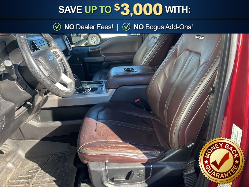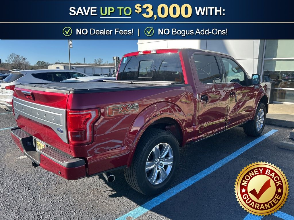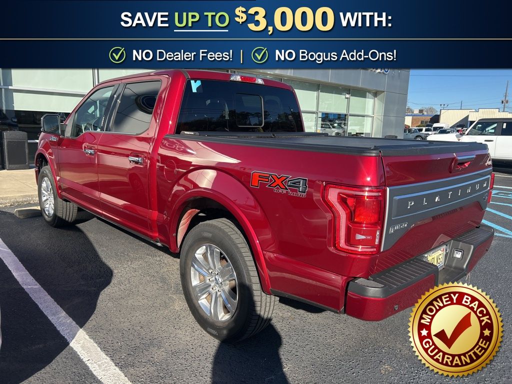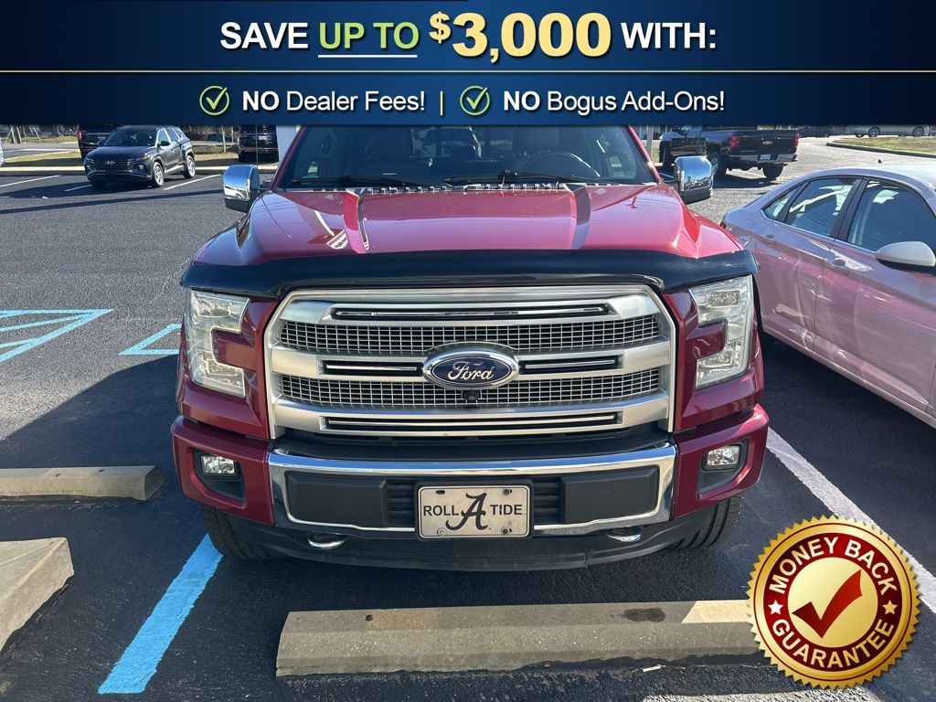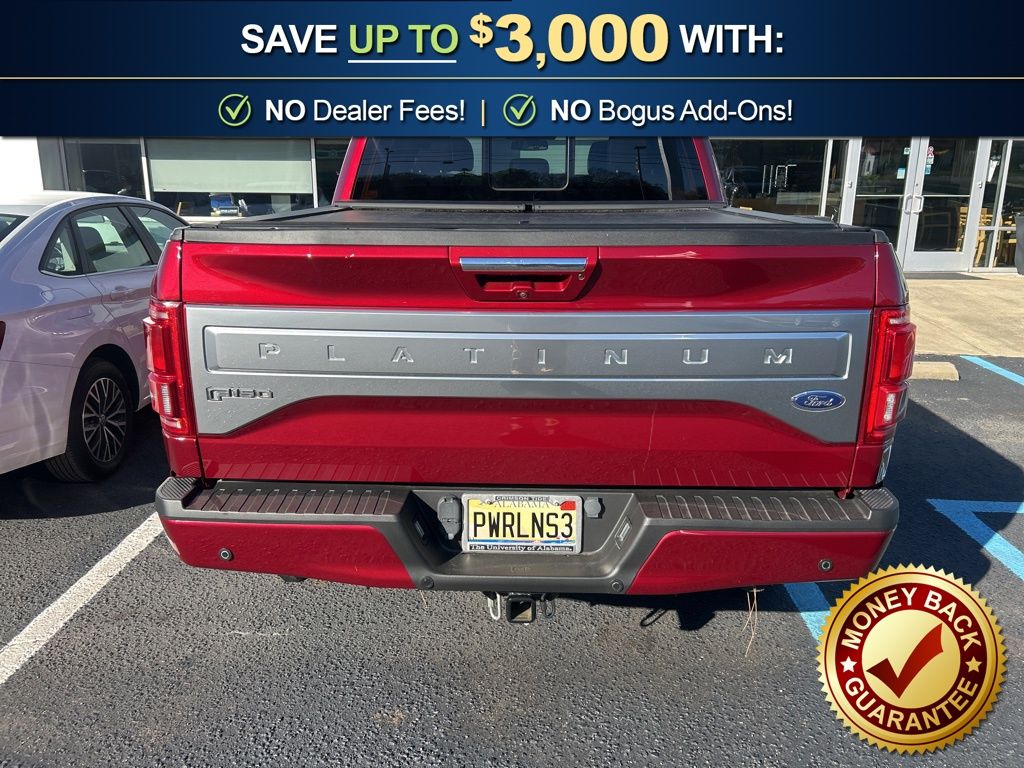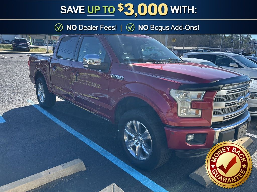 4WD, 10 Speakers, 20" Polished Aluminum Wheels, 4-Wheel Disc Brakes, 4x4 FX4 Off-Road Decal, ABS brakes, Active Park Assist, Adaptive Cruise Control & Collision Warning, Adjustable pedals, Air Conditioning, Alloy wheels, AM/FM radio: SiriusXM, Auto High-beam Headlights, Auto tilt-away steering wheel, Auto-dimming door mirrors, Auto-dimming Rear-View mirror, Automatic temperature control, Auxiliary Transmission Oil Cooler, Black Unique Multi-Contour Leather Bucket Seats, Brake assist, Bumpers: chrome, CD player, Class IV Trailer Hitch Receiver, Compass, Delay-off headlights, Driver door bin, Driver vanity mirror, Dual front impact airbags, Dual front side impact airbags, Electronic Stability Control, Equipment Group 701A Luxury, Exterior Parking Camera Rear, Front & Rear Off-Road Tuned Shock Absorbers, Front anti-roll bar, Front Bucket Seats, Front Center Armrest, Front dual zone A/C, Front fog lights, Front License Plate Bracket, Front reading lights, Front wheel independent suspension, Fully automatic headlights, FX4 Off-Road Package, Garage door transmitter, Genuine wood door panel insert, Heated door mirrors, Heated front seats, Heated rear seats, Heated steering wheel, Hill Descent Control, Illuminated entry, Integrated Trailer Brake Controller, Lane-Keeping System, Low tire pressure warning, Memory seat, Navigation System, Occupant sensing airbag, Outside temperature display, Overhead airbag, Overhead console, Panic alarm, Passenger door bin, Passenger vanity mirror, Pedal memory, Power door mirrors, Power driver seat, Power passenger seat, Power steering, Power windows, Premium audio system: Sony, Radio data system, Radio: Sony Single CD w/HD & SiriusXM Satellite, Rain sensing wipers, Rear Parking Sensors, Rear reading lights, Rear seat center armrest, Rear step bumper, Rear window defroster, Remote keyless entry, Security system, Speed control, Speed-sensing steering, Split folding rear seat, Steering wheel memory, Steering wheel mounted audio controls, SYNC with MyFord Touch, Tachometer, Tailgate Step w/Tailgate Lift Assist, Technology Package, Telescoping steering wheel, Tilt steering wheel, Traction control, Trailer Tow Package, Trip computer, Turn signal indicator mirrors, Twin Panel Moonroof, Upgraded Front Stabilizer Bar, Variably intermittent wipers, Ventilated front seats, Voice-Activated Navigation, Voltmeter, 4WD. 2015 Ford F-150 Platinum