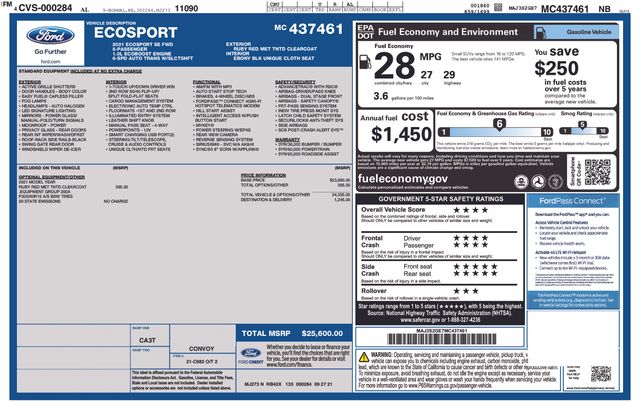 2021 Ford EcoSport SE SUV EcoBoost I3 GTDi DOHC Turbocharged VCT