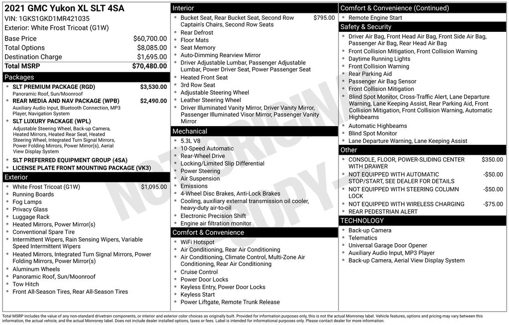 2021 GMC Yukon XL SLT RWD 10-Speed Automatic with Overdrive EcoTec3 5.3L V8 White Frost Tricoat
