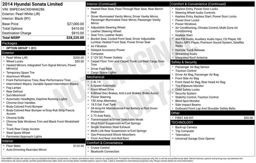 2014 Hyundai Sonata Limited FWD 6-Speed Automatic with Shiftronic 2.4L I4 DGI DOHC 16V ULEV II 190hp Pearl White