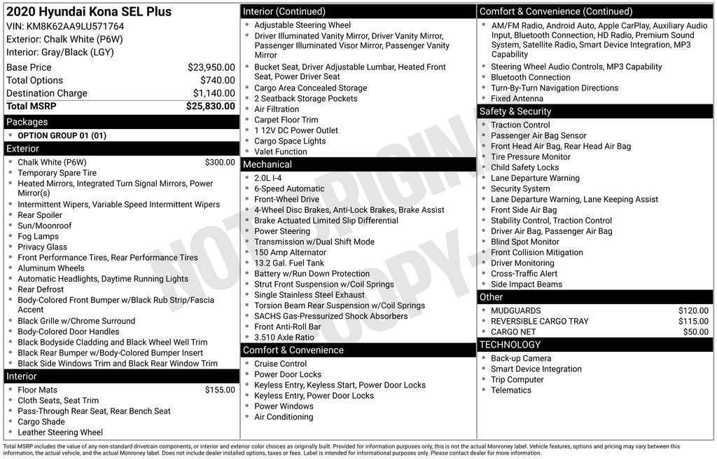 2020 Hyundai Kona SEL Plus Chalk White SEL Plus FWD 6-Speed Automatic with Shiftronic I4 3.510 Axle Ratio, 4-Wheel Disc Brakes, 8 Speakers, ABS brakes, Air Conditioning, Alloy wheels, AM/FM radio: SiriusXM, Apple CarPlay & Android Auto, Brake assist, Bumpers: body-color, Cargo Net, Carpeted Floor Mats, Cloth Seat Trim, Delay-off headlights, Driver door bin, Driver vanity mirror, Dual front impact airbags, Dual front side impact airbags, Electronic Stability Control, Emergency communication system: Blue Link Connected Care (3-year subscription), Exterior Parking Camera Rear, Front anti-roll bar, Front Bucket Seats, Front Center Armrest, Front fog lights, Front reading lights, Front wheel independent suspension, Fully automatic headlights, Heated door mirrors, Heated Front Bucket Seats, Heated front seats, Illuminated entry, Leather Shift Knob, Leather steering wheel, Low tire pressure warning, Mudguards, Occupant sensing airbag, Option Group 01, Outside temperature display, Overhead airbag, Overhead console, Panic alarm, Passenger door bin, Passenger vanity mirror, Power door mirrors, Power driver seat, Power moonroof, Power steering, Power windows, Radio: AM/FM/MP3/HD Radio/SiriusXM Audio System, Rear seat center armrest, Rear window defroster, Rear window wiper, Remote keyless entry, Reversible Cargo Tray, Roof rack: rails only, Security system, Speed control, Speed-sensing steering, Split folding rear seat, Spoiler, Steering wheel mounted audio controls, Tachometer, Telescoping steering wheel, Tilt steering wheel, Traction control, Trip computer, Turn signal indicator mirrors, Variably intermittent wipers, Wheels: 17 x 7.0J Alloy.