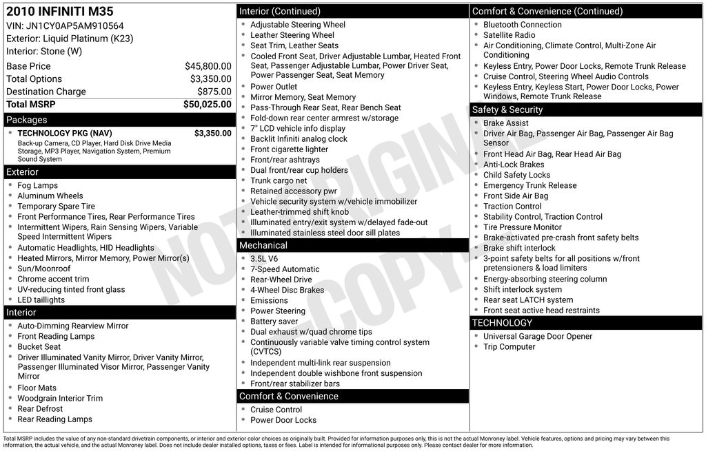 2010 INFINITI M35 RWD 7-Speed Automatic 3.5L V6 DOHC 24V Liquid Platinum Metallic