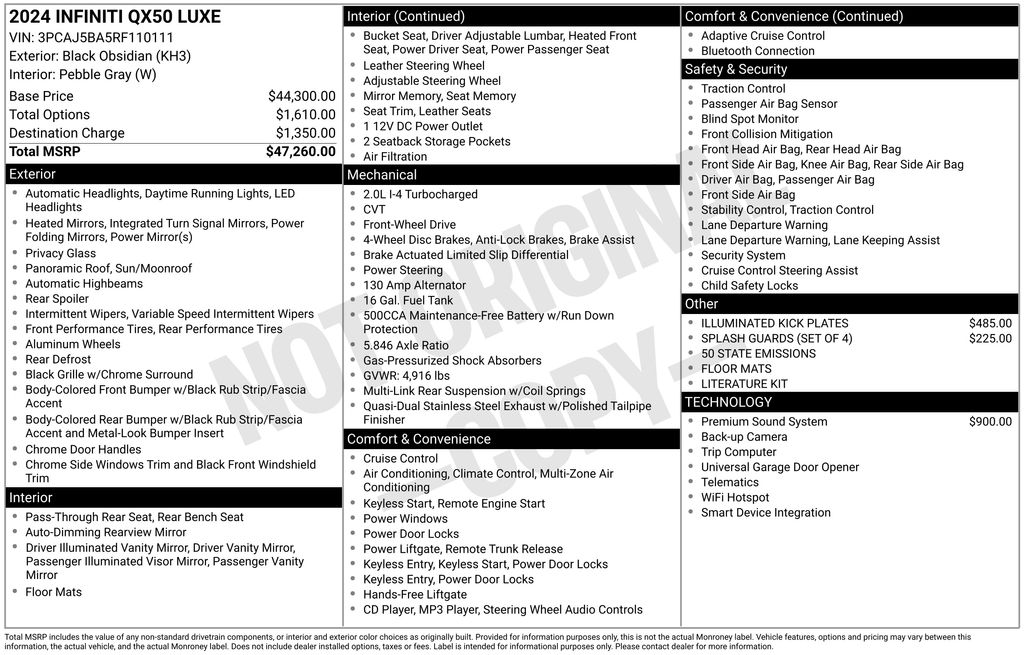 4-Wheel Disc Brakes, 5.846 Axle Ratio, 6 Speakers, ABS brakes, Air Conditioning, Alloy wheels, AM/FM radio: SiriusXM, Auto High-beam Headlights, Auto-dimming Rear-View mirror, Automatic temperature control, Bose 12-Speaker Premium Audio, Brake assist, Bumpers: body-color, CD player, Delay-off headlights, Driver door bin, Driver vanity mirror, Dual front impact airbags, Dual front side impact airbags, Electronic Stability Control, Emergency communication system: INFINITI InTouch (1-year complimentary trial), Exterior Parking Camera Rear, Floor Mats, Four wheel independent suspension, Front anti-roll bar, Front Bucket Seats, Front Center Armrest, Front dual zone A/C, Front reading lights, Fully automatic headlights, Garage door transmitter: HomeLink, Heated door mirrors, Heated Front Bucket Seats, Heated front seats, Illuminated entry, Illuminated Kick Plates, Knee airbag, Leather Shift Knob, Leather steering wheel, Leather-Appointed Seat Trim, Literature Kit, Low tire pressure warning, Memory seat, Occupant sensing airbag, Outside temperature display, Overhead airbag, Overhead console, Panic alarm, Passenger door bin, Passenger vanity mirror, Power door mirrors, Power driver seat, Power Liftgate, Power moonroof, Power passenger seat, Power steering, Power windows, Radio data system, Radio: HD Audio System, Rear anti-roll bar, Rear Parking Sensors, Rear reading lights, Rear seat center armrest, Rear side impact airbag, Rear window defroster, Rear window wiper, Remote keyless entry, Security system, Speed control, Speed-sensing steering, Speed-Sensitive Wipers, Splash Guards (Set of 4), Split folding rear seat, Spoiler, Steering wheel mounted audio controls, Tachometer, Telescoping steering wheel, Tilt steering wheel, Traction control, Trip computer, Turn signal indicator mirrors, Variably intermittent wipers, Wheels: 19" Silver Painted Aluminum Alloy. 2024 INFINITI QX50 LUXE
