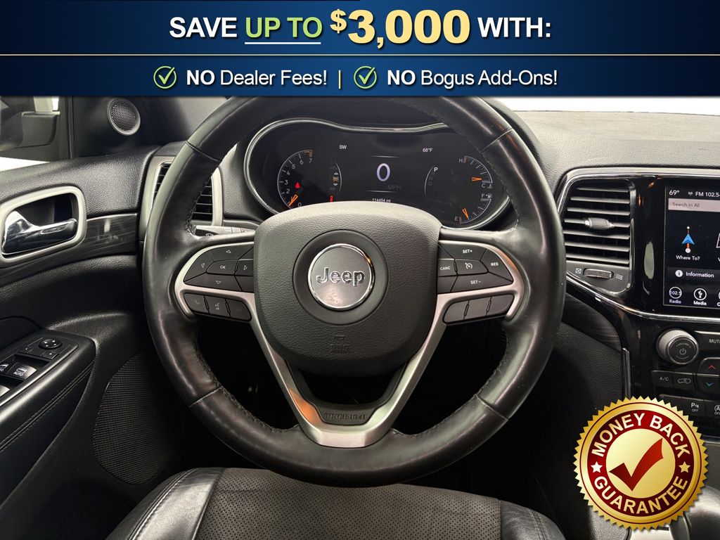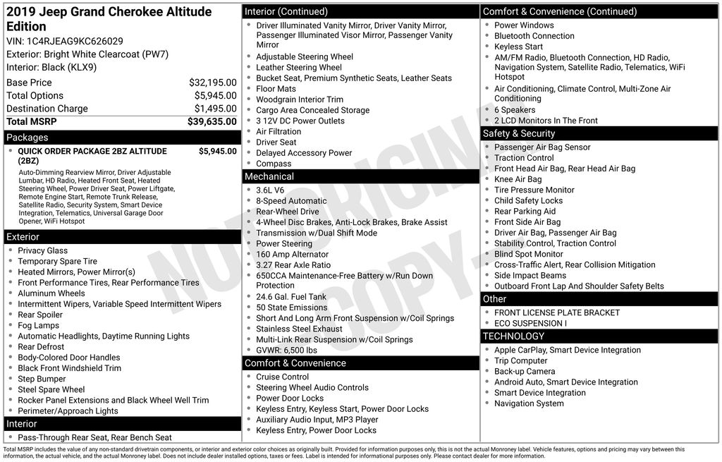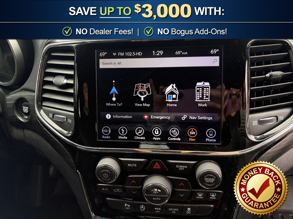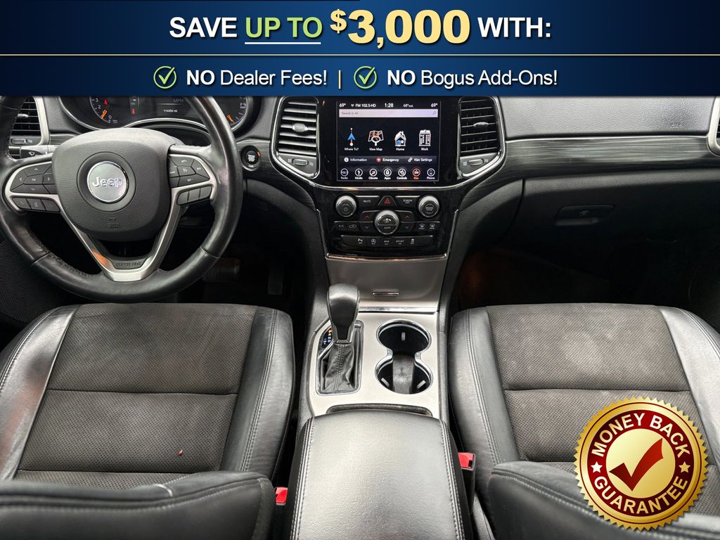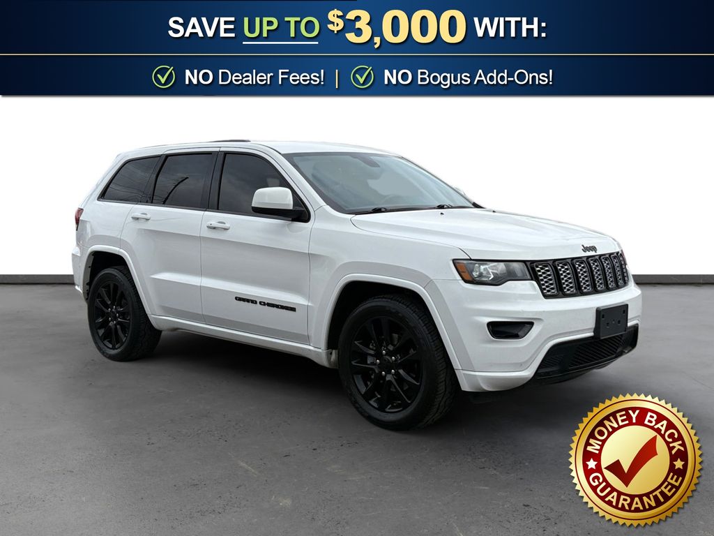 1-Year SiriusXM Radio Service, 1-Yr SiriusXM Guardian Trial, 115V Auxiliary Power Outlet, 3.27 Rear Axle Ratio, 4-Wheel Disc Brakes, 4G LTE Wi-Fi Hot Spot, 5-Year SiriusXM Traffic Service, 5-Year SiriusXM Travel Link Service, 6 Speakers, 8.4" Touchscreen Display, ABS brakes, Air Conditioning, Alloy wheels, Altitude Grille, Altitude IV Package, AM/FM radio, Anti-whiplash front head restraints, Apple CarPlay, Apple CarPlay/Android Auto, Auto-Dimming Rear-View Mirror, Automatic temperature control, Black Suede Seats w/Black Stitching, Body Color Claddings, Body Color Fascia, Body Color Shark Fin Antenna, Brake assist, Bumpers: body-color, Cargo Compartment Cover, Cloth Bucket Seats, Compass, Dark Day Light Opening Moldings, Dark Headlamp Bezel Finish, Dark Lens Taillamps, Delay-off headlights, Driver door bin, Driver vanity mirror, Dual front impact airbags, Dual front side impact airbags, Eco Suspension I, Electronic Stability Control, Four wheel independent suspension, Front Accent/Body Color Fascia, Front anti-roll bar, Front Bucket Seats, Front Center Armrest w/Storage, Front dual zone A/C, Front fog lights, Front License Plate Bracket, Front reading lights, Fully automatic headlights, Gloss Black Rear Fascia Applique, Google Android Auto, GPS Antenna Input, GPS Navigation, HD Radio, Heated door mirrors, Heated Front Seats, Heated Steering Wheel, Illuminated entry, Integrated Center Stack Radio, Integrated Voice Command w/Bluetooth, Jeep Black Gloss Badging, Knee airbag, Leather Shift Knob, Low tire pressure warning, Occupant sensing airbag, Outside temperature display, Overhead airbag, Overhead console, Panic alarm, ParkView Rear Back-Up Camera, Passenger door bin, Passenger vanity mirror, Power 4-Way Driver Lumbar Adjust, Power 8-Way Driver/Manual Passenger Seat, Power door mirrors, Power Liftgate, Power steering, Power windows, Quick Order Package 2BZ Altitude, Radio data system, Radio: Uconnect 4 w/7" Display, Radio: Uconnect 4C Nav w/8.4" Display, Rear Accent/Body Color Fascia, Rear anti-roll bar, Rear Fascia Black MIC Step Pad, Rear reading lights, Rear seat center armrest, Rear window defroster, Rear window wiper, Remote keyless entry, Security & Convenience Group, Security Alarm, Single Exhaust w/Bright Tip, SiriusXM Satellite Radio, SiriusXM Traffic Plus, SiriusXM Travel Link, Speed control, Speed-sensing steering, Speed-Sensitive Wipers, Split folding rear seat, Spoiler, Steering Wheel Mounted Audio Controls, Steering wheel mounted audio controls, Tachometer, Telescoping steering wheel, Tilt steering wheel, Traction control, Trip computer, Universal Garage Door Opener, USB Host Flip, Variably intermittent wipers, Wheels: 17" x 8.0" Silver Aluminum, Wheels: 20" x 8.0" Gloss Black Aluminum. 2019 Jeep Grand Cherokee Altitude
