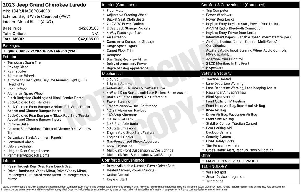Drive with confidence in this Bright White Clearcoat 2023 Jeep Grand Cherokee Laredo 4x4 with a stylish Global Black Cloth Interior. Powered by the legendary 3.6L V6 engine paired with an 8-Speed Automatic Transmission, this SUV delivers strength, reliability, and refined comfort.