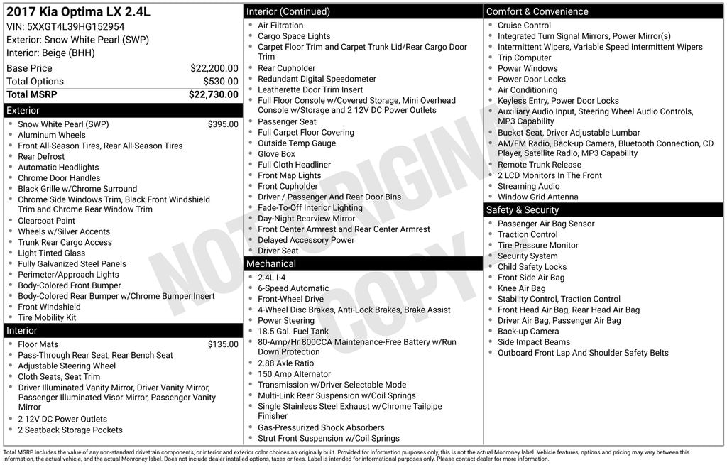 Drive in confidence with this sharp 2017 Kia Optima LX, finished in Snow White Pearl with a comfortable Beige Cloth Interior. Powered by a reliable 2.4L I4 Engine paired with a smooth 6-Speed Automatic Transmission, this Optima delivers efficiency and comfort for everyday driving.