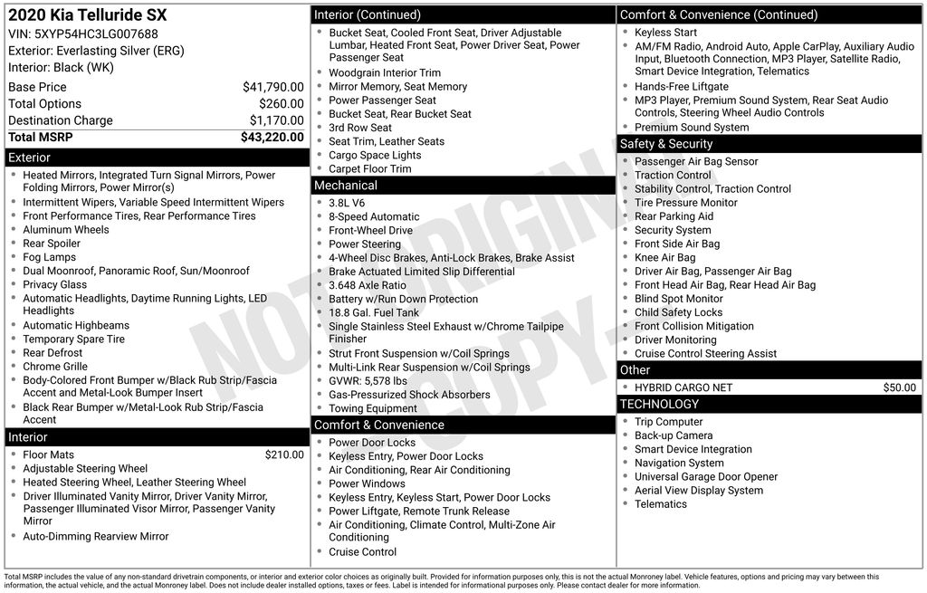 2020 Kia Telluride SX SUV V6 DGI DOHC Dual CVVT
