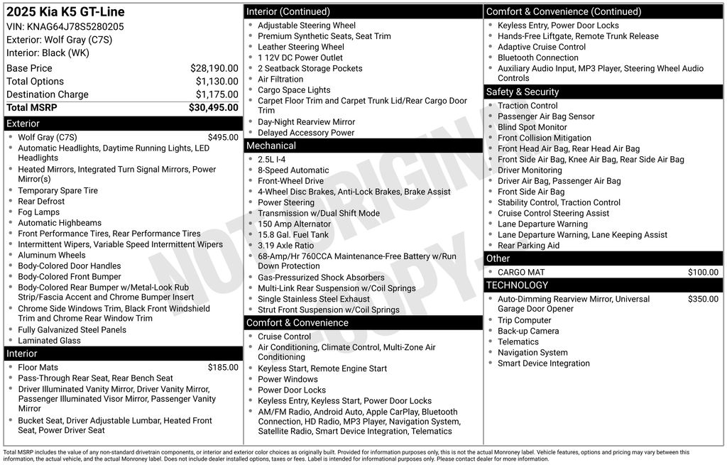 4-Wheel Disc Brakes, 6 Speakers, ABS brakes, Air Conditioning, Alloy wheels, AM/FM radio: SiriusXM, Auto High-beam Headlights, Automatic temperature control, Brake assist, Bumpers: body-color, Cargo Mat, Carpeted Floor Mats, Delay-off headlights, Driver door bin, Driver vanity mirror, Dual front impact airbags, Dual front side impact airbags, EC Mirror w/Homelink, Electronic Stability Control, Emergency communication system: Kia Connect (includes 1 year free trial), Four wheel independent suspension, Front anti-roll bar, Front Bucket Seats, Front Center Armrest, Front dual zone A/C, Front fog lights, Front reading lights, Fully automatic headlights, Heated door mirrors, Heated Front Bucket Seats, Heated front seats, Heated steering wheel, Illuminated entry, Knee airbag, Leather Shift Knob, Leather steering wheel, Low tire pressure warning, Navigation System, Occupant sensing airbag, Outside temperature display, Overhead airbag, Overhead console, Panic alarm, Passenger door bin, Passenger vanity mirror, Power door mirrors, Power driver seat, Power steering, Power windows, Radio data system, Radio: AM/FM Audio System, Rear anti-roll bar, Rear seat center armrest, Rear side impact airbag, Rear window defroster, Remote keyless entry, Security system, Speed control, Speed-sensing steering, Split folding rear seat, Sport steering wheel, Steering wheel mounted audio controls, Tachometer, Telescoping steering wheel, Tilt steering wheel, Traction control, Trip computer, Turn signal indicator mirrors, Variably intermittent wipers, Wheels: 18" x 7.5J Gloss Black Machined Finish Alloy. 2025 Kia K5 GT-Line
