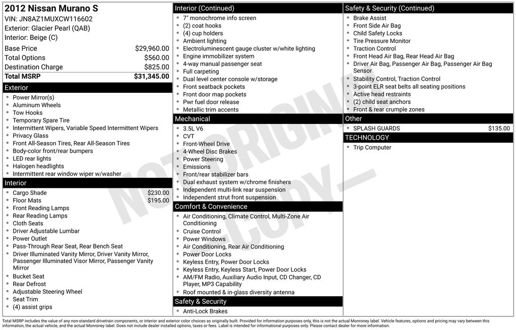 2012 Nissan Murano S SUV V6 DOHC 24V