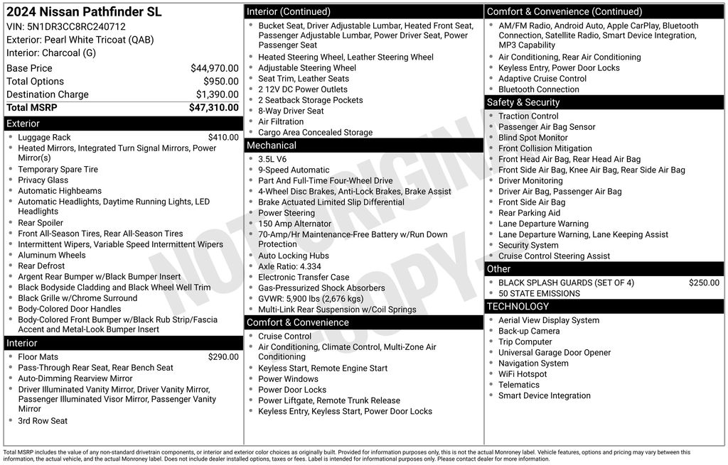 2024 Nissan Pathfinder SL 4WD 9-Speed Automatic 3.5L V6 DOHC Pearl White Tricoat