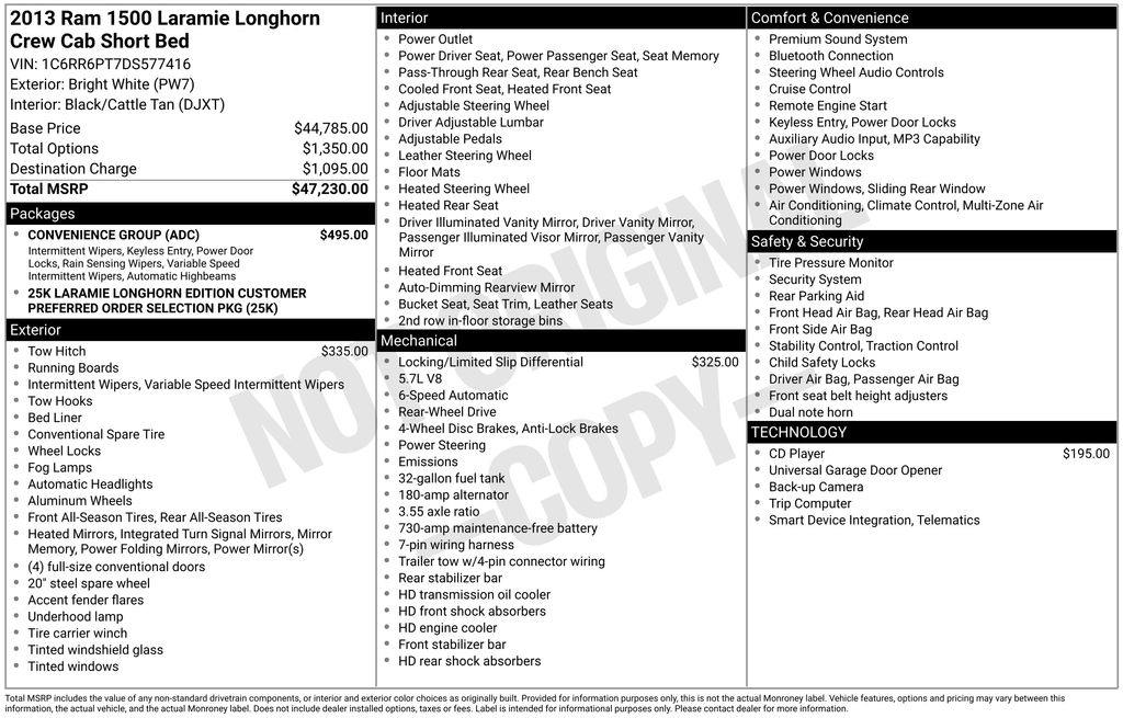 2013 Ram 1500 Laramie Longhorn RWD 6-Speed Automatic HEMI 5.7L V8 Multi Displacement VVT Bright White Clearcoat