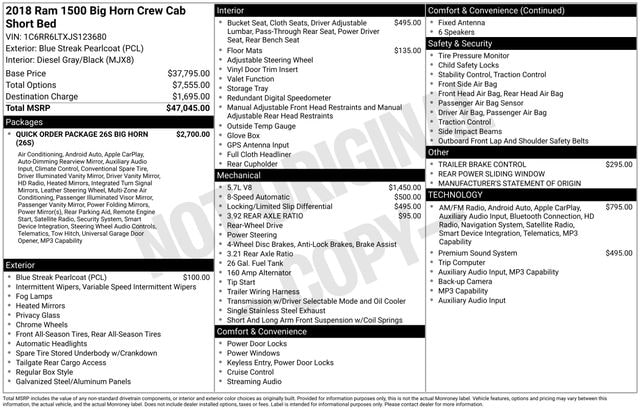 2018 Ram 1500 Big Horn Truck HEMI V8 Multi Displacement VVT