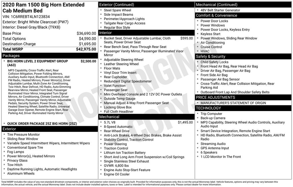 115V Auxiliary Power Outlet, 115V Auxiliary Rear Power Outlet, 2 USB Full Function/Charge Only Media Hub, 3 Rear Seat Head Restraints, 3.21 Rear Axle Ratio, 4 Way Front Headrests, 4-Wheel Disc Brakes, 400W Inverter, 48V Belt Starter Generator, 6 Speakers, ABS brakes, Air Conditioning, Air Conditioning ATC w/Dual Zone Control, Alloy wheels, AM/FM radio, Auto-Dimming Rear-View Mirror, Big Horn Badge, Big Horn IP Badge, Big Horn Level 2 Equipment Group, Black Premium Power Mirrors, Brake assist, Bumpers: chrome, Class IV Receiver Hitch, Cloth Bench Seat, Cluster 7.0" TFT Color Display, Compass, Dampened Tailgate, Delay-off headlights, Driver door bin, Dual front impact airbags, Dual front side impact airbags, Electronic Stability Control, Foam Bottle Insert (Door Trim Panel), Front anti-roll bar, Front Center Armrest w/Storage, Front fog lights, Front reading lights, Front Seat Back Map Pockets, Front wheel independent suspension, Fully automatic headlights, Glove Box Lamp, GPS Antenna Input, Heated door mirrors, Heated Front Seats, Heated Steering Wheel, Illuminated entry, Leather steering wheel, Low tire pressure warning, Manual Adjust 4-Way Front Passenger Seat, Manufacturer's Statement of Origin, Occupant sensing airbag, Outside temperature display, Overhead airbag, Overhead console, Panic alarm, ParkSense Front/Rear Park Assist w/Stop, ParkView Rear Back-Up Camera, Passenger door bin, Passenger vanity mirror, Power 4-Way Driver Lumbar Adjust, Power 8-Way Driver Seat, Power Adjustable Pedals, Power door mirrors, Power steering, Power windows, Quick Order Package 25Z Big Horn, Radio data system, Radio: Uconnect 3 w/5" Display, Radio: Uconnect 4 w/8.4" Display, Rear 60/40 Folding Seat, Rear anti-roll bar, Rear Dome w/On/Off Switch Lamp, Rear Power Sliding Window, Rear seat center armrest, Rear step bumper, Rear Window Defroster, Remote keyless entry, Remote Start System, Security Alarm, SiriusXM Satellite Radio, Speed control, Split folding rear seat, Steering wheel mounted audio controls, Sun Visors w/Illuminated Vanity Mirrors, Tachometer, Telescoping steering wheel, Tilt steering wheel, Traction control, Trip computer, Universal Garage Door Opener, Variably intermittent wipers, Voltmeter, Wheels: 18" x 8" Cast-Aluminum Painted. 2020 Ram 1500 Big Horn/Lone Star