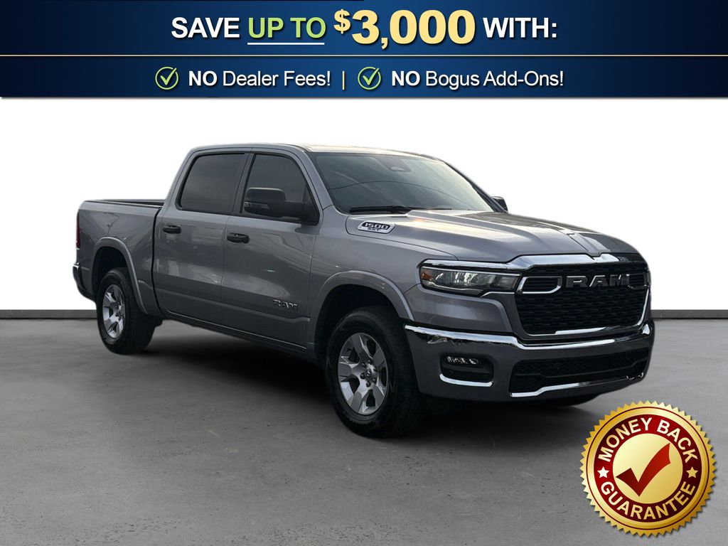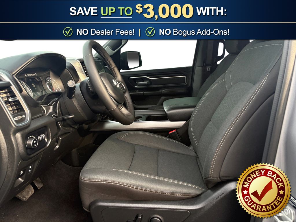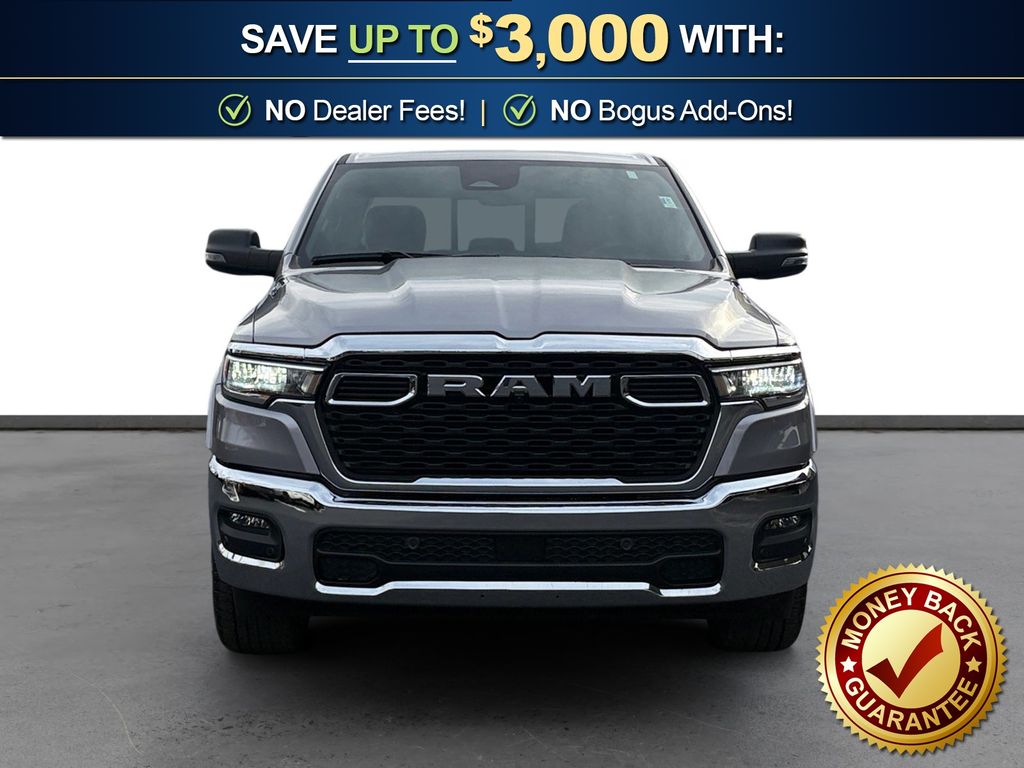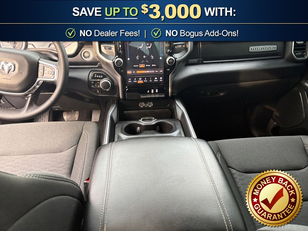 115V Auxiliary Power Outlet, 115V Auxiliary Rear Power Outlet, 12" Touchscreen Display, 2nd Row In Floor Storage Bins, 3 Rear Seat Head Restraints, 4 Way Front Headrests, 4-Wheel Disc Brakes, 400W Inverter, 4G LTE Wi-Fi Hot Spot, 6 Speakers, 9 Amplified Speakers w/Subwoofer, ABS brakes, Air Conditioning, Air Conditioning ATC w/Dual Zone Control, Alloy wheels, AM/FM radio, Apple CarPlay, Apple CarPlay/Android Auto, Auto High-beam Headlights, Auto Power-Folding Mirrors, Auto-Dimming Exterior Driver Mirror, Auto-Dimming Rear-View Mirror, Big Horn Level 2 Equipment Group, Black Exterior Mirrors, Black Premium Power Mirrors, Brake assist, Bumpers: chrome, Cloth Bench Seat, Cluster 7.0" TFT Color Display, Compass, Configurable Drive Mode, Connected Travel & Traffic Services, Connectivity - US/Canada, Convex Wide-Angle Exterior Mirror Insert, Delay-off headlights, Driver door bin, Dual front impact airbags, Dual front side impact airbags, Electronic Stability Control, Exterior Mirrors Courtesy Lamps, Exterior Mirrors w/Heating Element, Exterior Mirrors w/Supplemental Signals, Front anti-roll bar, Front Center Armrest w/Storage, Front fog lights, Front License Plate Bracket, Front reading lights, Front Seat Back Map Pockets, Front wheel independent suspension, Fully automatic headlights, Glove Box Lamp, Google Android Auto, GPS Antenna Input, GPS Navigation, HD Radio, Heated door mirrors, Heated Front Seats, Heated Steering Wheel, Illuminated entry, Integrated Voice Command w/Bluetooth, Leather Wrapped Steering Wheel, LED Dome Lamp w/On/Off Switch, LED Footwell Lighting, Low tire pressure warning, Manual Adjust 4-Way Front Passenger Seat, Manual Folding Exterior Mirrors, Manufacturer's Statement of Origin, Media Hub w/2 Charge Only USBs, Occupant sensing airbag, Outside temperature display, Overhead airbag, Overhead console, Overhead LED Lamps, Panic alarm, ParkView Rear Back-Up Camera, Passenger door bin, Passenger vanity mirror, Power 2-Way Driver Lumbar Adjust, Power Adjust 8-Way Driver Seat, Power Adjustable Pedals, Power door mirrors, Power steering, Power windows, Premium Overhead Console, Quick Order Package 21Z Big Horn, Radio data system, Radio: Uconnect 5 Nav w/12.0" Display, Radio: Uconnect 5 W w/8.4" Display, RAM Grille Badge - Chrome, Rear 60/40 Folding Seat, Rear anti-roll bar, Rear Power Sliding Window, Rear seat center armrest, Rear step bumper, Rear Window Defroster, Remote keyless entry, Remote Tailgate Release, Security Alarm, SiriusXM w/360L, Speed control, Split folding rear seat, Steering Wheel Mounted Audio Controls, Sun Visors w/Illuminated Vanity Mirrors, Supplier Part Tracking (J-1), Tachometer, Telescoping steering wheel, Tilt steering wheel, Traction control, Trip computer, Universal Garage Door Opener, USB Host Flip, Variably intermittent wipers, Voltmeter, Wheels: 18" x 8" Cast-Aluminum Painted. 2025 Ram 1500 Big Horn/Lone Star