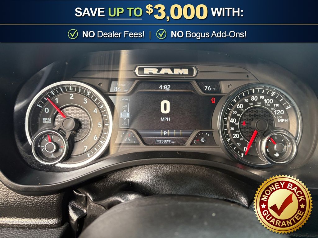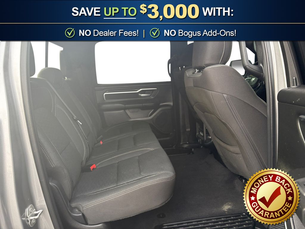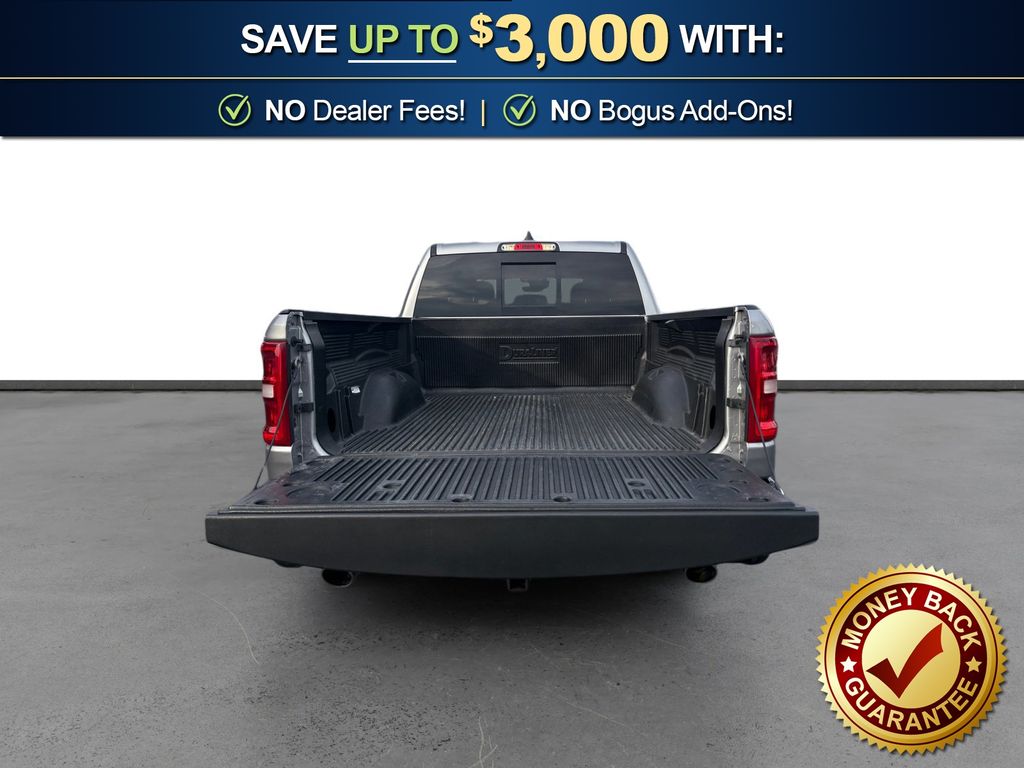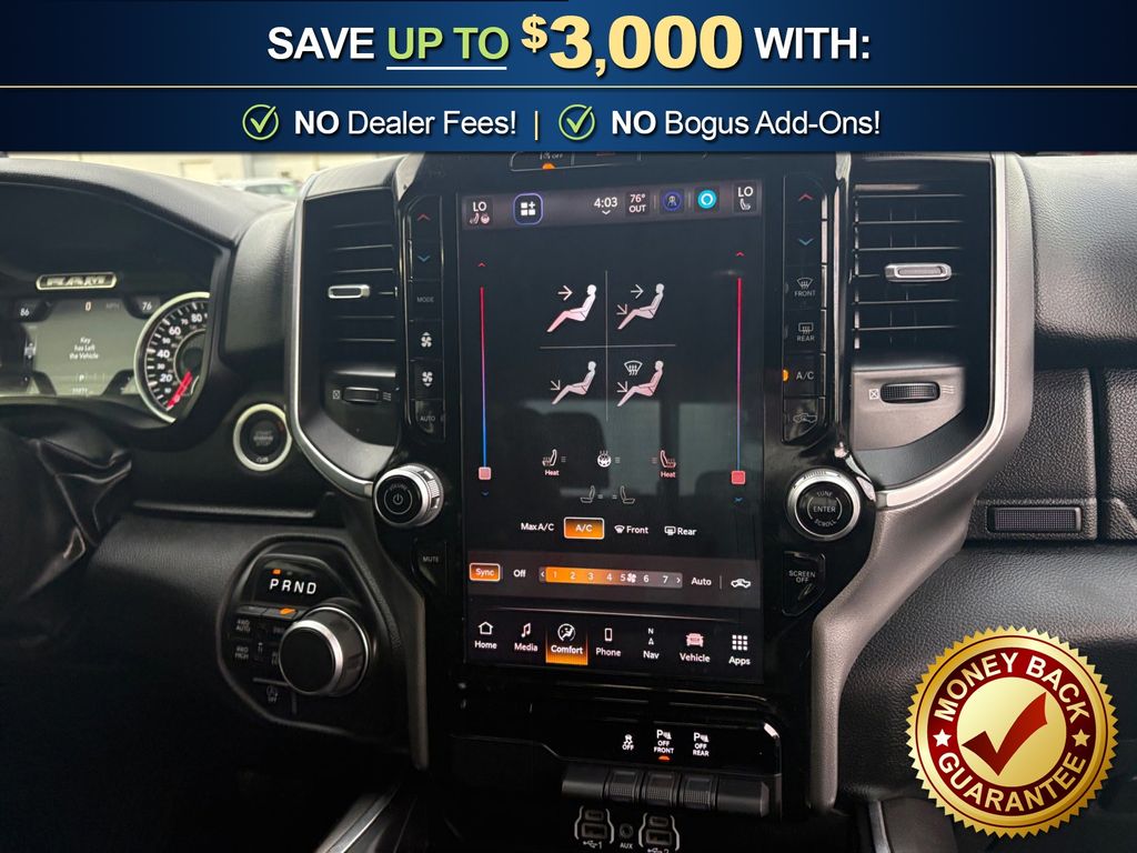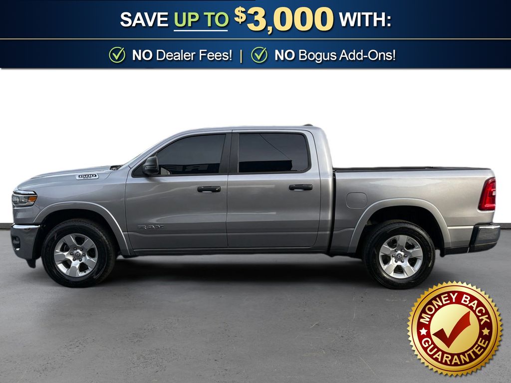 115V Auxiliary Power Outlet, 115V Auxiliary Rear Power Outlet, 12" Touchscreen Display, 2nd Row In Floor Storage Bins, 3 Rear Seat Head Restraints, 4 Way Front Headrests, 4-Wheel Disc Brakes, 400W Inverter, 4G LTE Wi-Fi Hot Spot, 6 Speakers, 9 Amplified Speakers w/Subwoofer, ABS brakes, Air Conditioning, Air Conditioning ATC w/Dual Zone Control, Alloy wheels, AM/FM radio, Apple CarPlay, Apple CarPlay/Android Auto, Auto High-beam Headlights, Auto Power-Folding Mirrors, Auto-Dimming Exterior Driver Mirror, Auto-Dimming Rear-View Mirror, Big Horn Level 2 Equipment Group, Black Exterior Mirrors, Black Premium Power Mirrors, Brake assist, Bumpers: chrome, Cloth Bench Seat, Cluster 7.0" TFT Color Display, Compass, Configurable Drive Mode, Connected Travel & Traffic Services, Connectivity - US/Canada, Convex Wide-Angle Exterior Mirror Insert, Delay-off headlights, Driver door bin, Dual front impact airbags, Dual front side impact airbags, Electronic Stability Control, Exterior Mirrors Courtesy Lamps, Exterior Mirrors w/Heating Element, Exterior Mirrors w/Supplemental Signals, Front anti-roll bar, Front Center Armrest w/Storage, Front fog lights, Front License Plate Bracket, Front reading lights, Front Seat Back Map Pockets, Front wheel independent suspension, Fully automatic headlights, Glove Box Lamp, Google Android Auto, GPS Antenna Input, GPS Navigation, HD Radio, Heated door mirrors, Heated Front Seats, Heated Steering Wheel, Illuminated entry, Integrated Voice Command w/Bluetooth, Leather Wrapped Steering Wheel, LED Dome Lamp w/On/Off Switch, LED Footwell Lighting, Low tire pressure warning, Manual Adjust 4-Way Front Passenger Seat, Manual Folding Exterior Mirrors, Manufacturer's Statement of Origin, Media Hub w/2 Charge Only USBs, Occupant sensing airbag, Outside temperature display, Overhead airbag, Overhead console, Overhead LED Lamps, Panic alarm, ParkView Rear Back-Up Camera, Passenger door bin, Passenger vanity mirror, Power 2-Way Driver Lumbar Adjust, Power Adjust 8-Way Driver Seat, Power Adjustable Pedals, Power door mirrors, Power steering, Power windows, Premium Overhead Console, Quick Order Package 21Z Big Horn, Radio data system, Radio: Uconnect 5 Nav w/12.0" Display, Radio: Uconnect 5 W w/8.4" Display, RAM Grille Badge - Chrome, Rear 60/40 Folding Seat, Rear anti-roll bar, Rear Power Sliding Window, Rear seat center armrest, Rear step bumper, Rear Window Defroster, Remote keyless entry, Remote Tailgate Release, Security Alarm, SiriusXM w/360L, Speed control, Split folding rear seat, Steering Wheel Mounted Audio Controls, Sun Visors w/Illuminated Vanity Mirrors, Supplier Part Tracking (J-1), Tachometer, Telescoping steering wheel, Tilt steering wheel, Traction control, Trip computer, Universal Garage Door Opener, USB Host Flip, Variably intermittent wipers, Voltmeter, Wheels: 18" x 8" Cast-Aluminum Painted. 2025 Ram 1500 Big Horn/Lone Star
