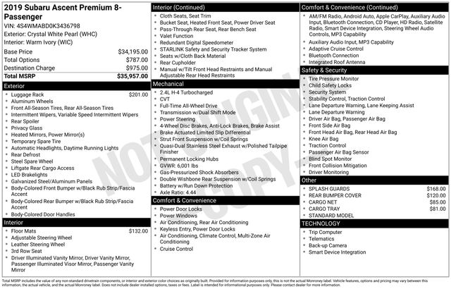 The 2019 Subaru Ascent Premium is built for busy lives and long trips. With standard AWD, generous space, and Subaruâs reputation for safety, this SUV is ready for carpools, road trips, and everything in between.