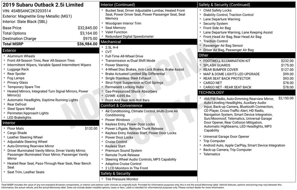 When our Honda CRV was totaled by an idiot in a pick up truck, we started shopping around. We examined all the other alternatives from Ford, GM, Honda, Toyota, Nissan, Hyundai, but it was when the Outback was taken for a test drive it IMMEDIATLY set itself apart from its competitors! Road noise, minimal; interior comfort, OUTSTANDING; road handling, a dream; electronics, mind-blowing array including safety systems; ALSO, and you cannot find this on ANY 2019 SUV in it's class, a CD PLAYER in addition to the satellite and broadcast radio! Yep, a physical real CD player, which means we don't have to put all our music on USB sticks! Ours is the 4 cylinder model, but even still, when you kick down on the accelerator (not the paddle switch on the steering wheel) it can deliver some very impressive acceleration! The back is absolutely cavernous compared to its competition, even before you put the rear seats in a down position! The array of controls available on the steering wheel is impressive to say the least, and will take a bit of learning to get fully comfortable with. When you consider ALL of the standard features, including safety features, that are extra on most of its competition, together with how the vehicle itself performs, this really is a no brainer! Detroit has a LOT of catching up to do, & mainstream Japan automakers, while maybe having the same technology, don't even come close to this level of appointments as standard at this price point! - 5.0