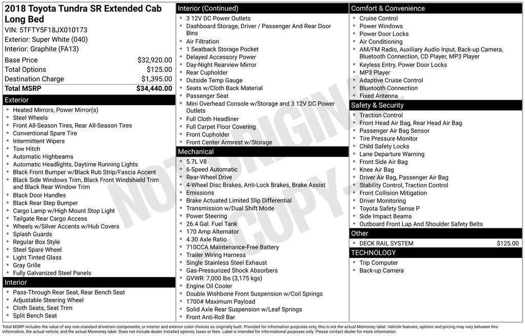2018 Toyota Tundra SR RWD 6-Speed Automatic Electronic with Overdrive i-Force 5.7L V8 DOHC 32V LEV White