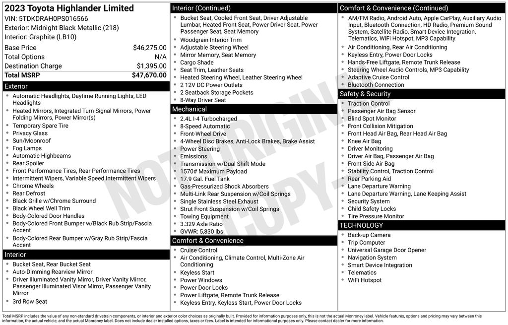 2023 Toyota Highlander Limited FWD 8-Speed Automatic 2.4L I4 PDI Turbocharged DOHC 16V LEV3-SULEV30 265hp Midnight Black Metallic