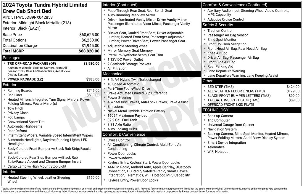 2024 Toyota Tundra Hybrid Limited Midnight Black Metallic Limited 4WD 10-Speed Automatic 3.4L V6 3.4L V6, 3.31 Axle Ratio, 4-Wheel Disc Brakes, ABS brakes, Air Conditioning, Alloy wheels, AM/FM radio: SiriusXM, Apple CarPlay/Android Auto, Auto High-beam Headlights, Auto-dimming door mirrors, Auto-dimming Rear-View mirror, Automatic temperature control, Black Front Bumper Letters (TMS), Brake assist, Bumpers: body-color, Delay-off headlights, Driver door bin, Driver vanity mirror, Dual front impact airbags, Dual front side impact airbags, Electronic Stability Control, Emergency communication system: Safety Connect (10-year trial), Exterior Parking Camera Rear, Front anti-roll bar, Front Bucket Seats, Front Center Armrest, Front dual zone A/C, Front fog lights, Front reading lights, Front wheel independent suspension, Fully automatic headlights, Garage door transmitter: HomeLink, Heated & Ventilated Front Bucket Seats, Heated door mirrors, Heated front seats, Heated steering wheel, Illuminated entry, Knee airbag, Leather Shift Knob, Low tire pressure warning, Memory seat, Navigation System, Occupant sensing airbag, Outside temperature display, Overhead airbag, Overhead console, Panic alarm, Passenger door bin, Passenger vanity mirror, Power door mirrors, Power driver seat, Power passenger seat, Power steering, Power windows, Radio data system, Radio: Premium Audio w/JBL, Rear reading lights, Rear seat center armrest, Rear step bumper, Rear window defroster, Remote keyless entry, Security system, Speed control, Speed-sensing steering, Split folding rear seat, Steering wheel mounted audio controls, Tachometer, Telescoping steering wheel, Tilt steering wheel, Traction control, Trip computer, Turn signal indicator mirrors, Variably intermittent wipers, Ventilated front seats, Voltmeter, 3.4L V6.