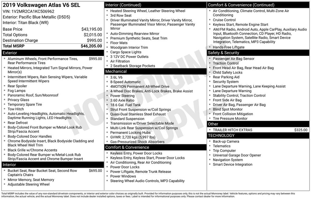 18" 5-Spoke Wheels, 20" Black Triple 5-Spoke Wheels, 2nd-Row Dual Captain's Chairs, 3.60 Axle Ratio, 3rd row seats: split-bench, 4-Wheel Disc Brakes, 8 Speakers, ABS brakes, Active Blind Spot Monitor, Air Conditioning, Alloy wheels, AM/FM radio: SiriusXM, Auto-dimming Rear-View mirror, Automatic temperature control, Brake assist, Bumpers: body-color, Compass, Delay-off headlights, Driver door bin, Driver vanity mirror, Dual front impact airbags, Dual front side impact airbags, Electronic Stability Control, Emergency communication system: VW Car-Net services (capabilities require enrollment or subscription), Exterior Parking Camera Rear, Forward collision: FCW w/Autonomous Emergency Braking mitigation, Four wheel independent suspension, Front anti-roll bar, Front Bucket Seats, Front Center Armrest, Front dual zone A/C, Front fog lights, Front reading lights, Garage door transmitter: HomeLink, Heated Comfort Front Bucket Seats, Heated door mirrors, Heated front seats, Heated steering wheel, Illuminated entry, Low tire pressure warning, Memory seat, Navigation System, Occupant sensing airbag, Outside temperature display, Overhead airbag, Overhead console, Panic alarm, Passenger door bin, Passenger vanity mirror, Power door mirrors, Power driver seat, Power Liftgate, Power moonroof, Power passenger seat, Power steering, Power windows, Radio data system, Radio: Discover Media 8.0" Touchscreen w/Nav, Rain sensing wipers, Rear air conditioning, Rear anti-roll bar, Rear reading lights, Rear seat center armrest, Rear window defroster, Rear window wiper, Remote CD player, Remote keyless entry, Roof rack: rails only, Security system, Speed control, Speed-sensing steering, Split folding rear seat, Spoiler, Standard Suspension, Steering wheel mounted audio controls, Tachometer, Telescoping steering wheel, Tilt steering wheel, Traction control, Trailer Hitch Extras (DISC), Trip computer, Turn signal indicator mirrors, V-Tex Leatherette Seating Surfaces, Variably intermittent wipers, Wheels: 20" Black Triple 5-Spoke Alloy. 2019 Volkswagen Atlas SEL 4Motion