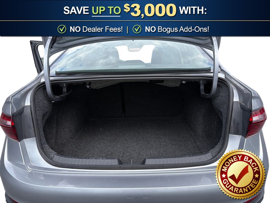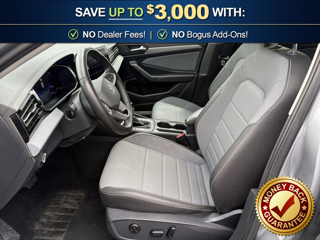 Titan Black w/Cloth Seat Trim, 4-Wheel Disc Brakes, 6 Speakers, ABS brakes, Active Blind Spot Monitor, Air Conditioning, Alloy wheels, AM/FM radio: SiriusXM with 360L, Auto-dimming Rear-View mirror, Automatic temperature control, Brake assist, Bumpers: body-color, CloudTex & V-Tex Leatherette Seat Trim, Delay-off headlights, Driver door bin, Driver vanity mirror, Dual front impact airbags, Dual front side impact airbags, Electronic Stability Control, Emergency communication system: VW Car-Net Safe & Secure 5-year, Exterior Parking Camera Rear, Front anti-roll bar, Front Bucket Seats, Front Center Armrest, Front dual zone A/C, Front wheel independent suspension, Fully automatic headlights, Heated door mirrors, Heated Front Seats, Heated front seats, Illuminated entry, Leather Shift Knob, Leather steering wheel, Low tire pressure warning, Occupant sensing airbag, Outside temperature display, Overhead airbag, Overhead console, Panic alarm, Passenger door bin, Passenger vanity mirror, Power door mirrors, Power driver seat, Power steering, Power windows, Radio data system, Radio: MIB3 Composition Media w/8" Touchscreen, Rain sensing wipers, Rear anti-roll bar, Rear reading lights, Rear seat center armrest, Rear window defroster, Remote keyless entry, Speed control, Speed-sensing steering, Split folding rear seat, Steering wheel mounted audio controls, Tachometer, Telescoping steering wheel, Tilt steering wheel, Traction control, Trip computer, Variably intermittent wipers, Wheels: 17" Twin 5-Spoke 2-Tone Machined Alloy, Titan Black w/Cloth Seat Trim. 2025 Volkswagen Jetta 1.5T SE